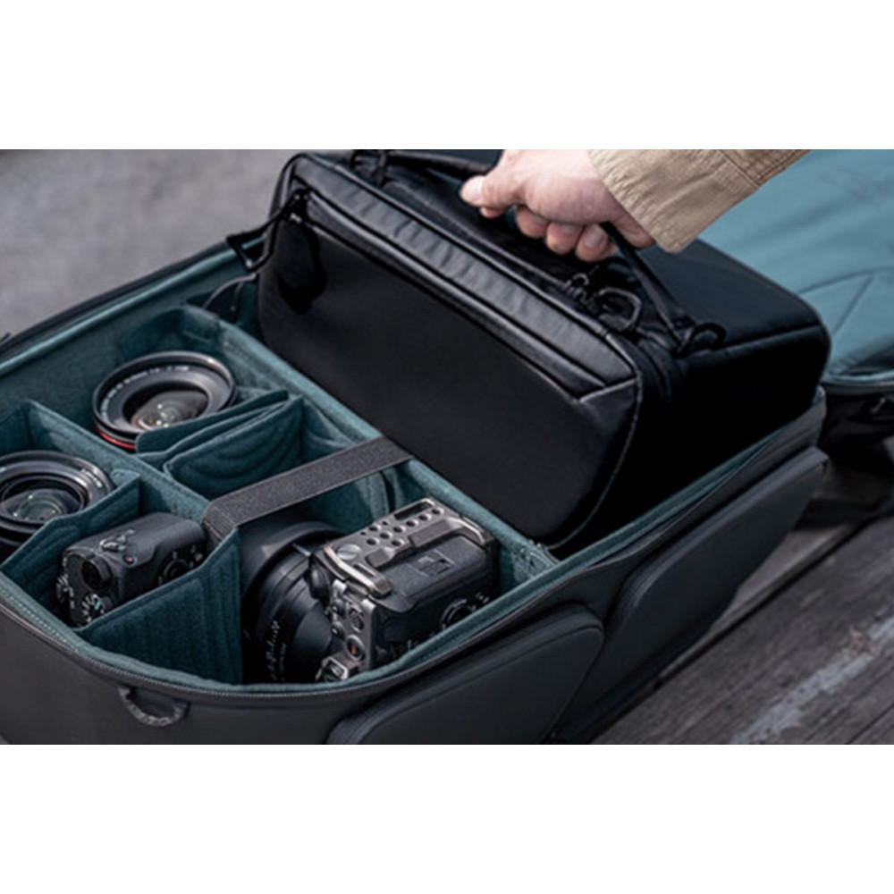 A nagy teljesítményű hátsó panel széles, vastag pánttal további kényelmet nyújt útközben. A csomag felső és jobb oldali hozzáféréssel rendelkezik a hosszú gyújtótávolságú objektívek könnyű megfogásához. A PU bevonatú felület és az esővédő borítás fröccsenésálló, és megvédi felszerelését a váratlan időjárástól. A vállpántokon zseb található a telefon tárolására, és lehetővé teszi egy opcionális fényképezőgép-kapocs rögzítését. Egyéb felhasználóorientált részletek, köztük a több fogantyú és rögzítési pont, az akkumulátor jelzőrendszer, az YKK cipzárak és a titkos AirTag zseb maximalizálják a kreatív élményt.