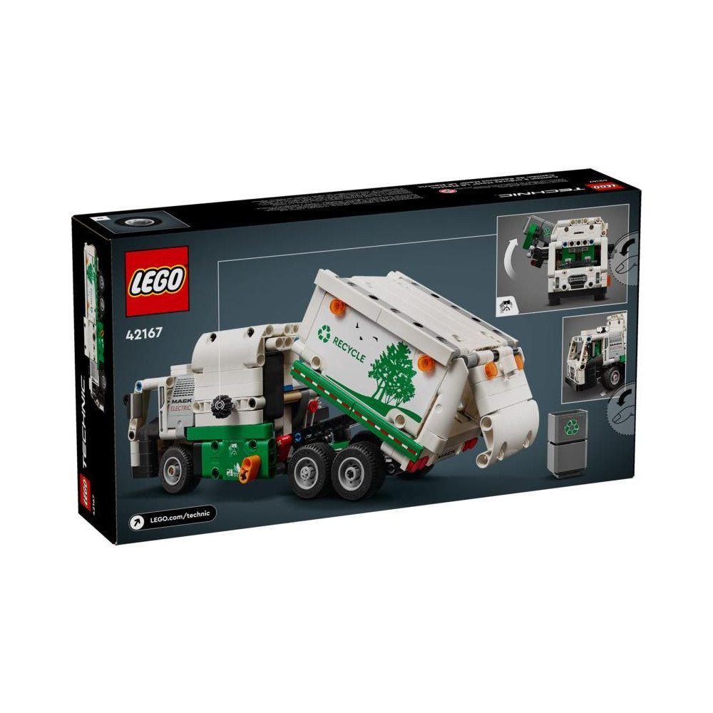 - Építhető 8 éves kortól - LEGO® Technic A Mack® LR elektromos szemeteskocsi oldalsó rakodóval rendelkezik, amely képes megragadni, felemelni és felborítani a szemeteseket.