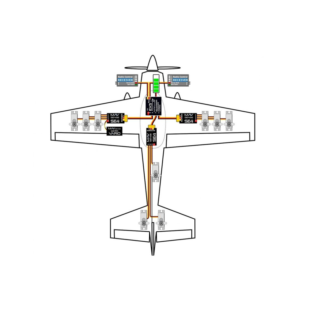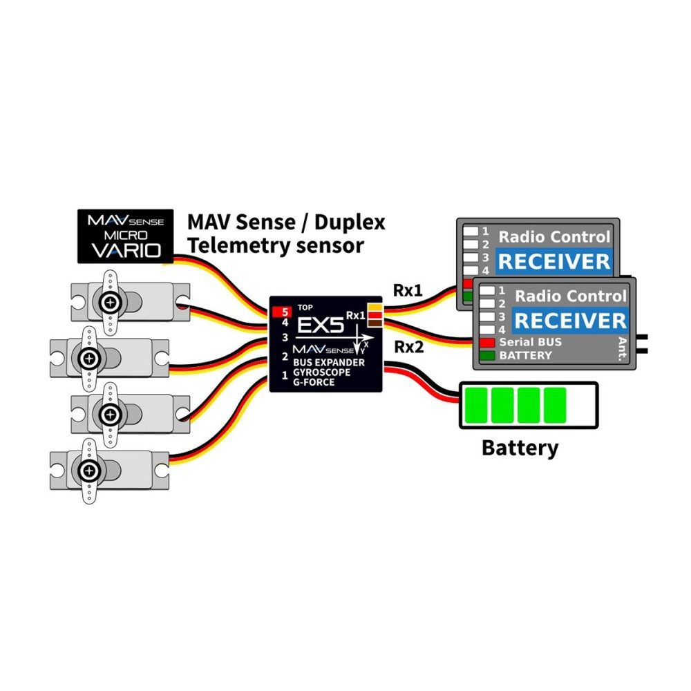 Az EX5K integrált MEMS giroszkóp/gyorsulásmérő segítségével repülésstabilizációt biztosít. Akár három konfigurálható repülési mód is használható, mindegyik különböző nyereséggel és stabilizációs beállításokkal. Más MAVSense eszközökkel, például az SE4 vagy SE6 készülékkel együtt meglehetősen bonyolult telepítést hozhat létre, nagyon kevés jel-/tápkábelt használva.