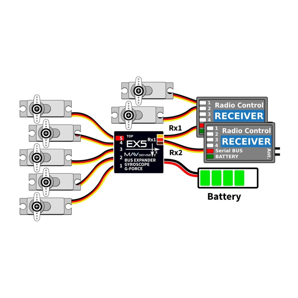 A Servo Expander EX5K egy intelligens soros buszmenedzser, amely számos rádióvezérlő rendszerrel kompatibilis. Az eszköz akár két vevőről érkező soros kommunikációs jelet alakítja át szabványos PWM szervokimenetekké vagy konfigurálható adatbusz kimenetekké. Akár öt konfigurálható és nagy terhelésű szervo portot kínál, választható periódus és hibabiztos beállításokkal.