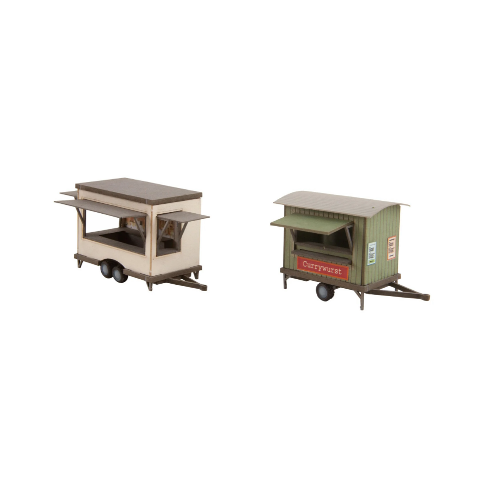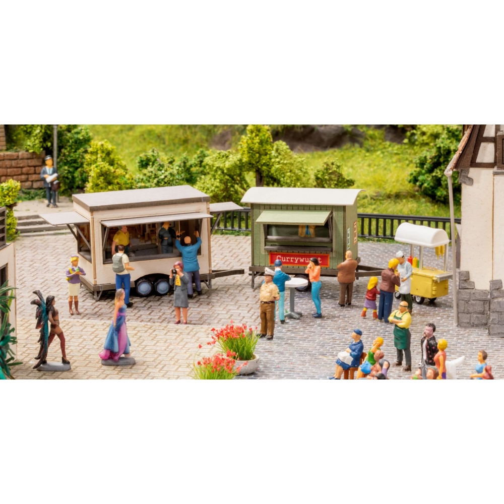 Mobilné stojany na občerstvenie NOCH sú ideálne na umiestnenie každodenných scén na modelovej železnici. Kto by to nepoznal, keď sa prechádzate mestom a chcete si dopriať osvieženie. Ideálne sú na to mobilné stojany na potraviny. Chutné občerstvenie medzitým vám dodá silu na celý deň. Či už je to klobása, chrumkavé hranolky alebo zdravá maškrta ako šalát – naozaj si tu nájde každý. Deň je zavŕšený lahodnou zmrzlinou v stánku so zmrzlinou za rohom. Preneste každodenné scény, ako je táto, do svojho rozloženia modelu a vytvorte skutočný pútač s „mobilným snack barom“.