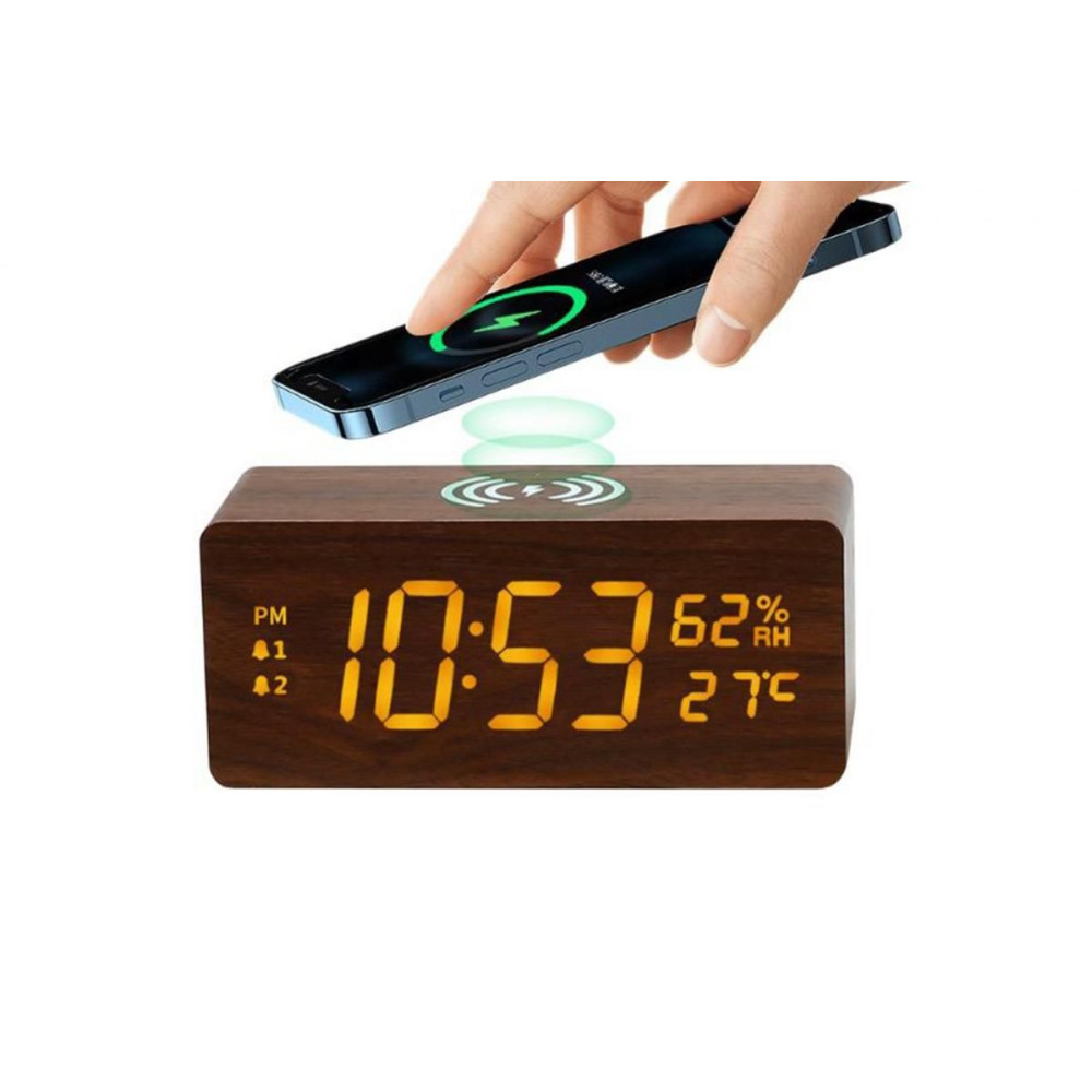 15W multifunkciós fa vezeték nélküli töltő, ébresztő és LED óra (akkumulátorral együtt)
