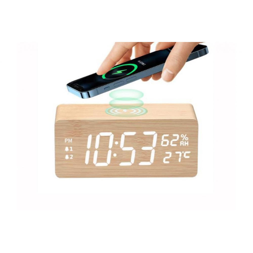 15 W-os multifunkcionális fa vezeték nélküli töltő, ébresztőóra és LED óra (akkumulátorral együtt)