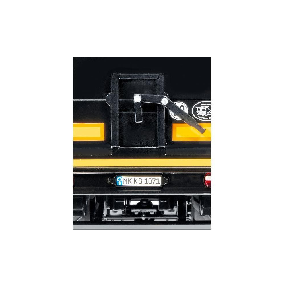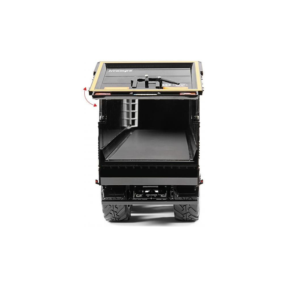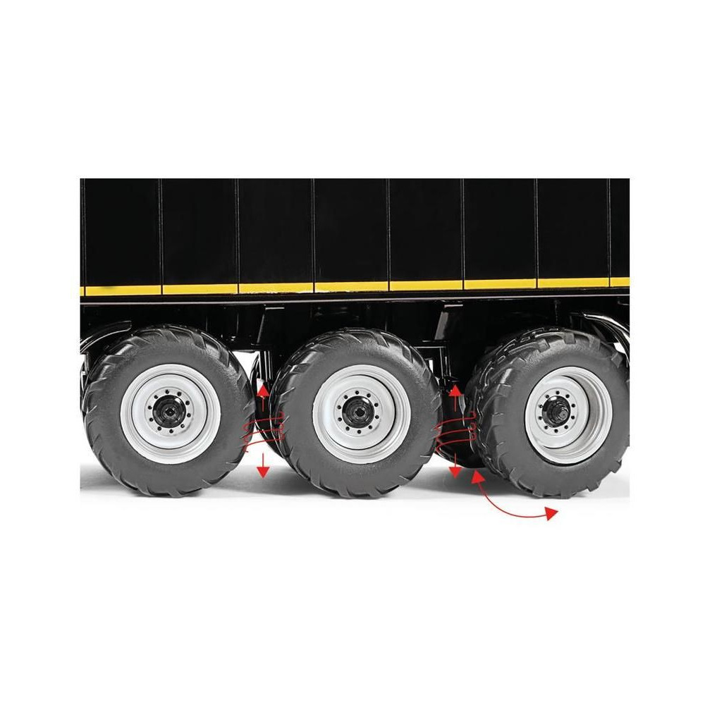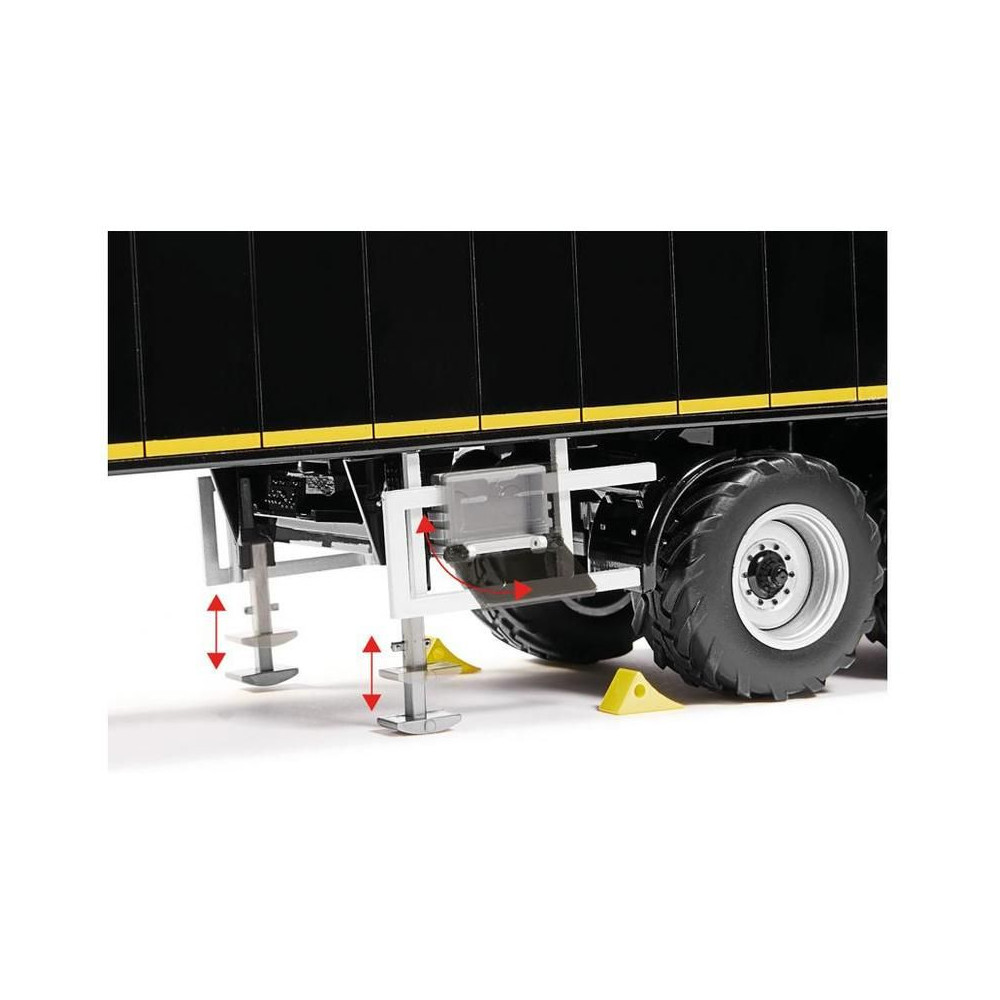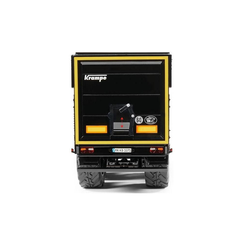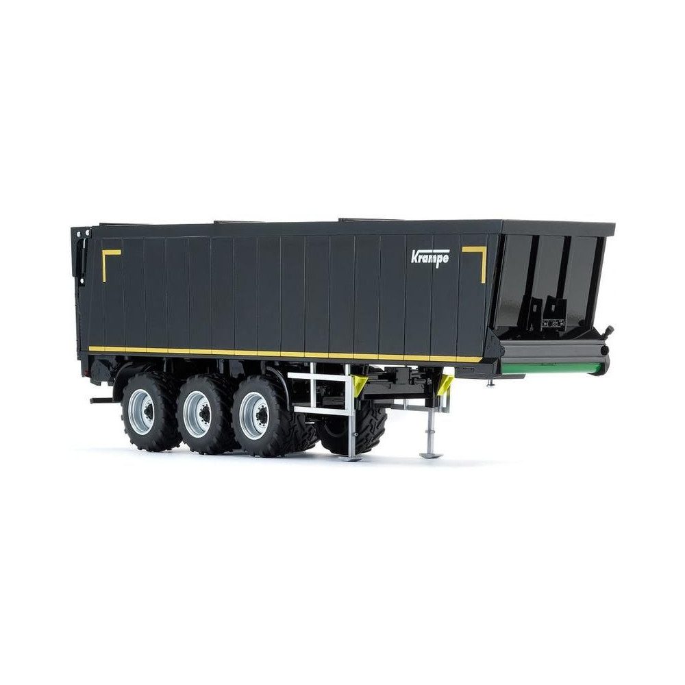Háromtengelyes félpótkocsi Krampe SB II 30/1070 - fekete, 1:32 méretarány. Tartalmazza a funkcionális kerékfelfüggesztést hátsó kormányzott tengellyel, emelőtengellyel, nyitható orral, finom adagolónyílással, kihúzható állványokkal, gumikerekekkel és kerékbilinccsel. A bal oldalon egy nyitható szerszámosláda található. Minőségi kivitelezés fémből és műanyagból.