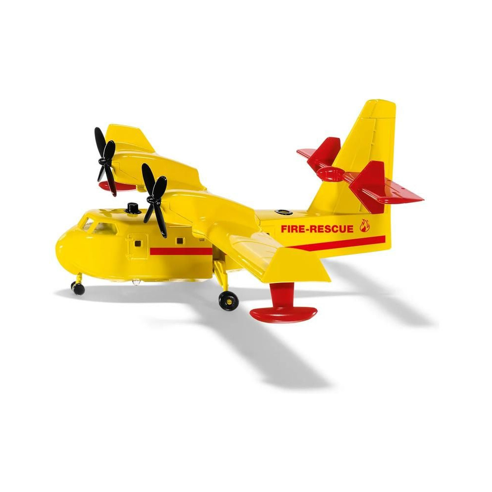Siku márkájú tűzoltó repülőgép fémmodellje. A modell csuklós alvázzal rendelkezik, és vízzel tölthető, majd a víz alulról leereszthető a tűz eloltásához. Játékra és gyűjtögetésre is alkalmas. Minőségi fém- és műanyagmegmunkálás.