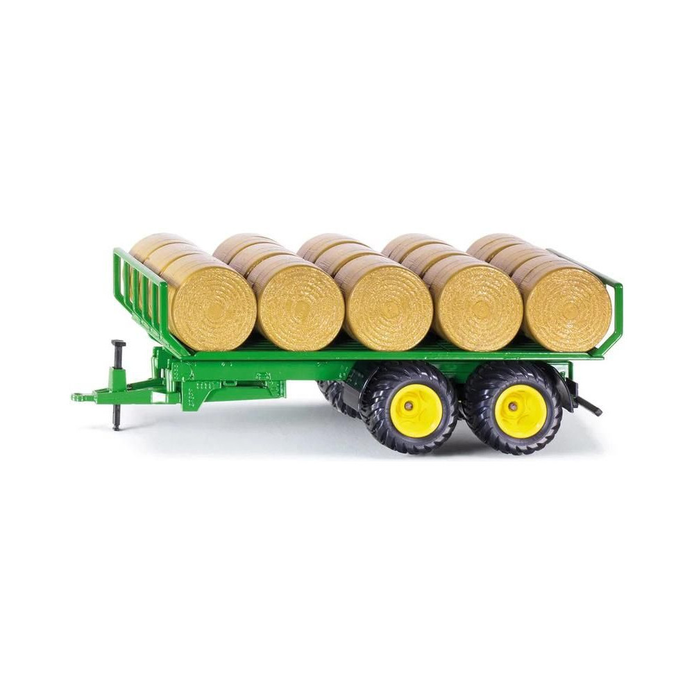 Kéttengelyes körbála-szállító pótkocsi fémmodellje 1:32 méretarányban. A falburkolat fém alvázas, a csomagok műanyagból készültek. Gumiabroncsok. Játékra és gyűjtögetésre is alkalmas. Minőségi fém- és műanyagmegmunkálás.