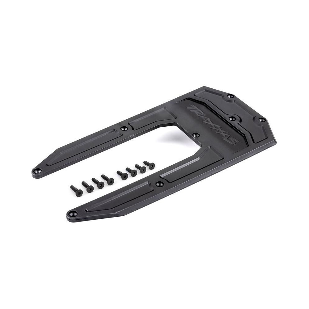 Tuning alkatrész RC modellautóhoz Traxxas Sledge: alvázfedél fekete. Az alumínium alváz aljának védelmére szolgál a karcolások és sérülések ellen. Tartalmazza a rögzítéshez szükséges csavarokat.