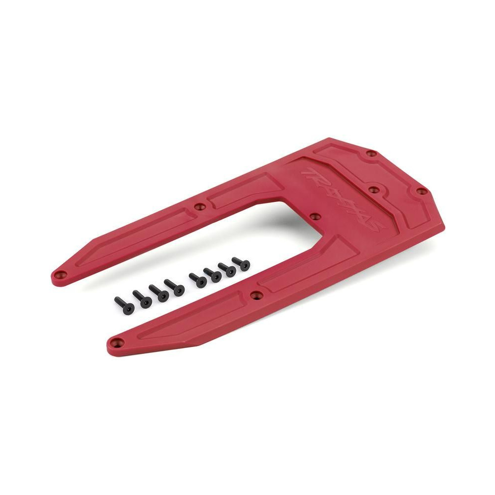 Tuning alkatrész RC modellautóhoz Traxxas Sledge: alvázfedél piros. Az alumínium alváz aljának védelmére szolgál a karcolások és sérülések ellen. Tartalmazza a rögzítéshez szükséges csavarokat.