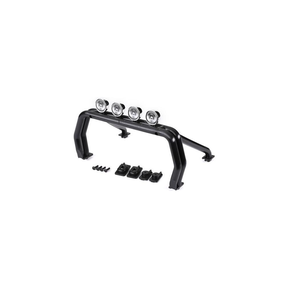 Fekete védőkeret felső fényszóróval karosszériához. Tartókonzol (elöl (2), hátul (bal és jobb))/ 2,6x12mm BCS csavar (4). TRX-4 Pick-up karosszériákhoz tervezve, pl. #9212 és #9230.