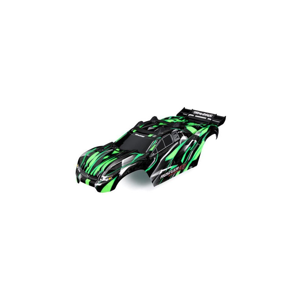 Pótalkatrész RC modellautókhoz Traxxas Rustler 4x4 Ultimate 1:10 VXL: karosszéria zöld. Festve, matricázva, összeszerelve, első és hátsó karosszériatartókkal és hátsó karosszériatartóval a klipsz nélküli rögzítéshez. Tengelytáv 295mm.