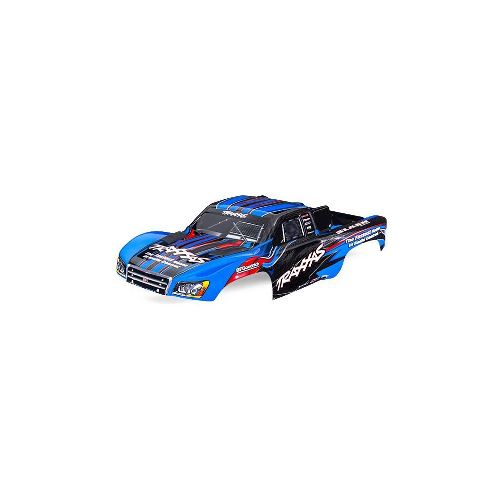 Pótalkatrész Traxxas Slash 2WD, VXL vagy 4x4 RC autó modellekhez: karosszéria kék, pótalkatrészek nélkül. Kész ProGraphix® színezéssel, előre felragasztott matricákkal. Összeszerelt karosszéria első és hátsó rugó nélküli reteszekkel.