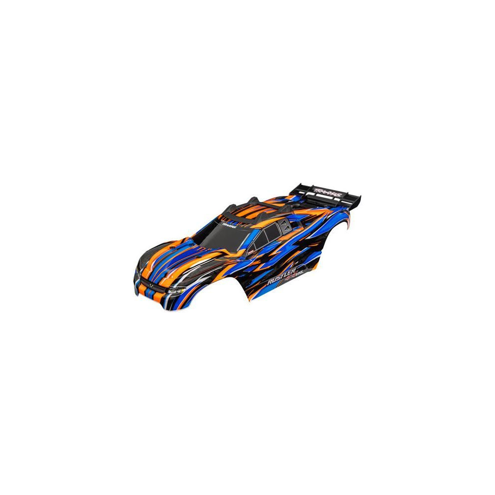 Pótalkatrész RC modellautókhoz Traxxas Rustler 4x4 1:10 VXL: karosszéria narancssárga. Festve, matricázva, összeszerelve, első és hátsó karosszériatartókkal és hátsó karosszériatartóval a klipsz nélküli rögzítéshez. Tengelytáv 295mm.