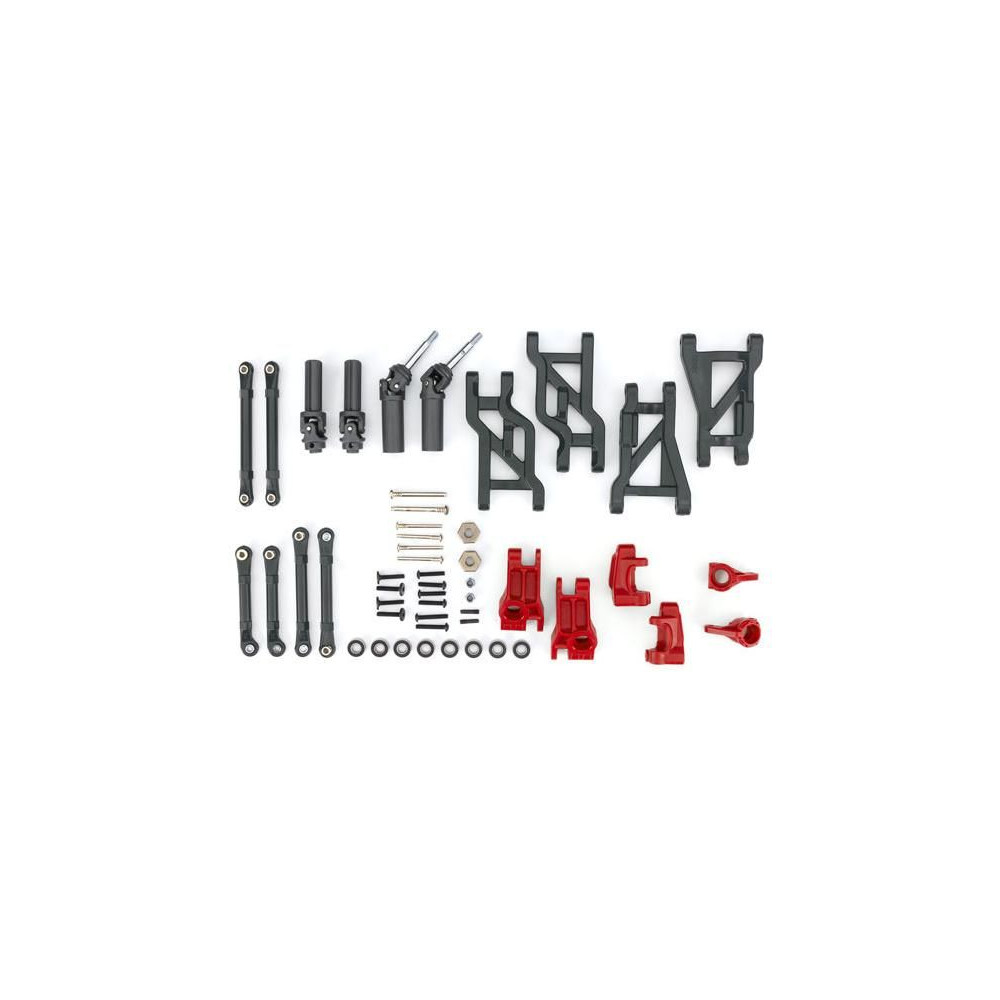 Extreme Heavy Duty felfüggesztés készlet - piros, nagy teherbírású. Frissítse fel modellje szabadon álló részeit ezzel a készlettel, amely a Traxxas által használt legkeményebb anyagokból készült. Akár durva terepen száguldasz, akár ugrálsz a modelleddel, ezt a készletet úgy tervezték, hogy tartós legyen. A csomagban olyan egyedi alkatrészek találhatók, amelyek könnyen kicserélhetők az eredetivel.