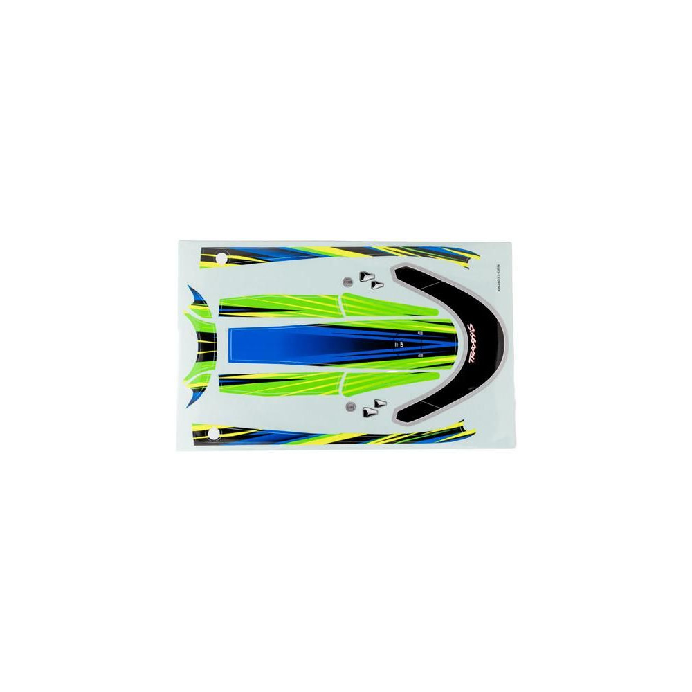 Pótalkatrész a Traxxas Disruptor RC modellhez: zöld fedélzeti matricák.