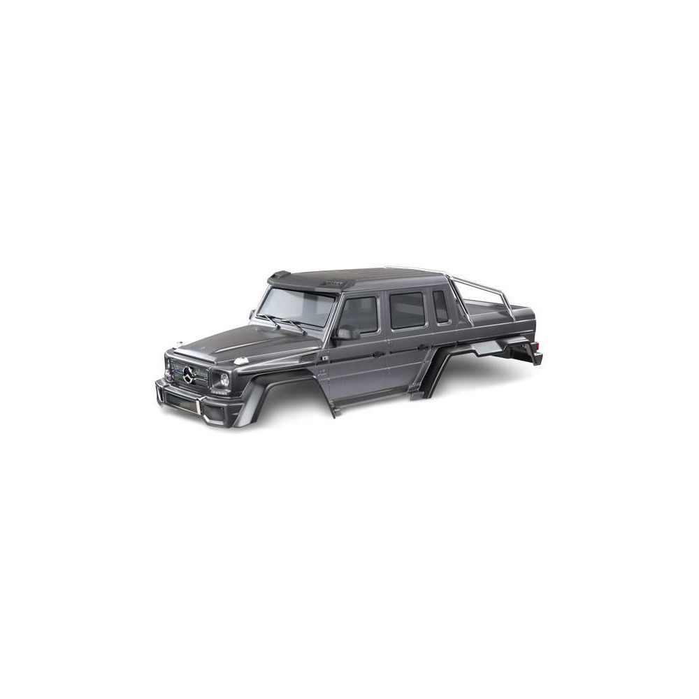 Traxxas karosszéria Mercedes-Benz G 63 ezüst (klipszmentes). Komplett, színes. Beleértve az első hűtőrácsot, az oldalsó tükröket, az ajtókilincseket, egyéb részleteket és a klipszmentes rögzítőrendszert. #8080X és #8828X kerékjárati ívekre való felszerelésre szánták.