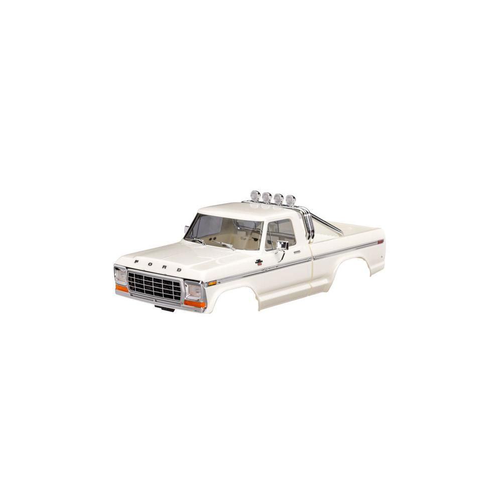 Traxxas Ford F-150 1979 fehér, TRX-4M RC modellautóhoz, hosszabb tengelytávval 162 mm (High Trail). 1:18 méretarányú ABS nem szponzorált karosszéria, teljes, beleértve a hűtőrácsot, tükröket, ajtókilincseket, védőkeretet, ablaktörlőket, oldalsó korlátokat és egyéb részleteket. TRA9834 első és hátsó lökhárítót igényel.