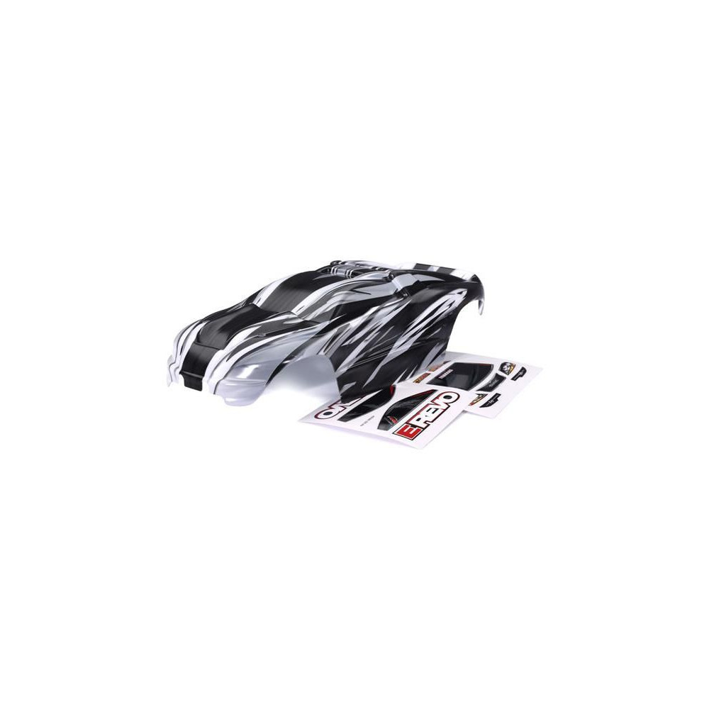 Traxxas E-Revo 1:16 ProGraphix karosszéria, matricás ívvel együtt. Válassza ki a saját színezését, használja az előre nyomtatott grafikákat, hogy saját színes kreációkat hozzon létre. Azonnali professzionális eredmény! A karosszéria teljes mértékben le van vágva, előre kifúrt lyukakkal. Védő overspray fólia.