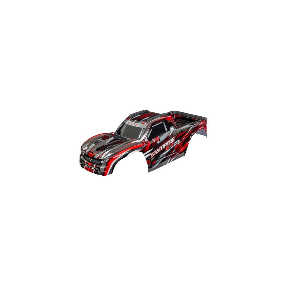 Pótalkatrész RC modellautókhoz Traxxas Stampede 4x4 1:10 VXL: karosszéria piros. Festve, matricázva, összeszerelve, első és hátsó karosszériatartókkal és hátsó karosszériatartóval a klipsz nélküli rögzítéshez. Tengelytáv 295mm.