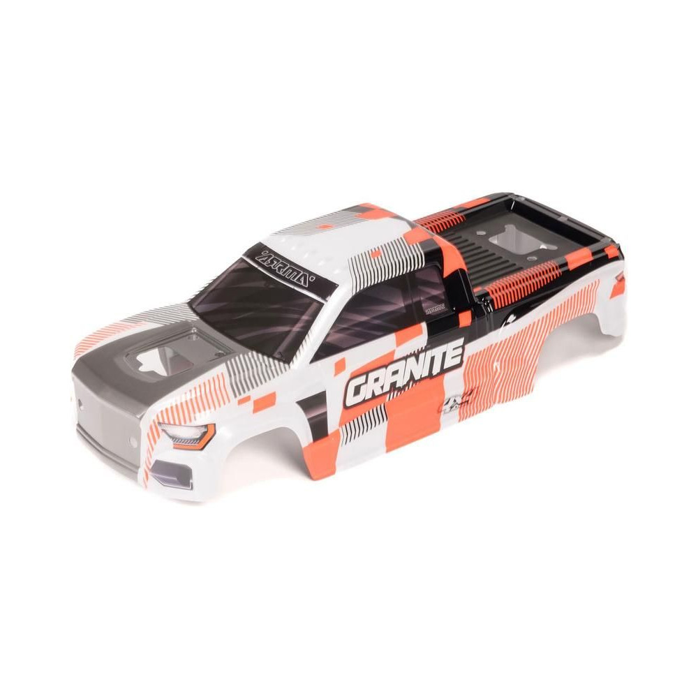 Alkatrész az Arrma Granite 223S BLX 1:10 4WD RC modellautóhoz: narancssárga karosszéria. Festett, applikált grafikákkal díszített.