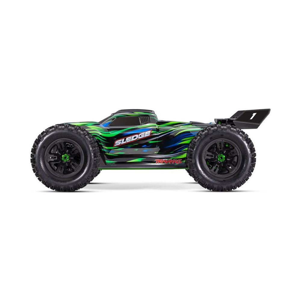 Hihetetlenül erős RC modellautó Traxxas Sledge 1:8, a legapróbb részletekig finomhangolva.112 km/h sebességig. Elektronika telemetria támogatással és TSM stabilizálással, TQi RC kit, alumínium alváz, küllők nélküli karosszéria, újonnan megerősített Sledgehammer gumikkal.