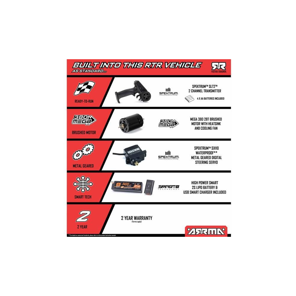Az alváz jobb oldalán található az erőforrás, amely egy ARRMA MEGA 380 28T motorból áll, masszív hűtővel és egy integrált 25A vezérlővel és vevővel. Az alkatrészek között egy új ventilátor kapott helyet a még hatékonyabb hűtés érdekében.