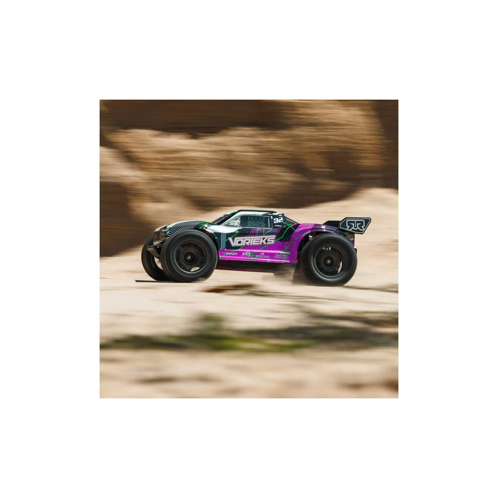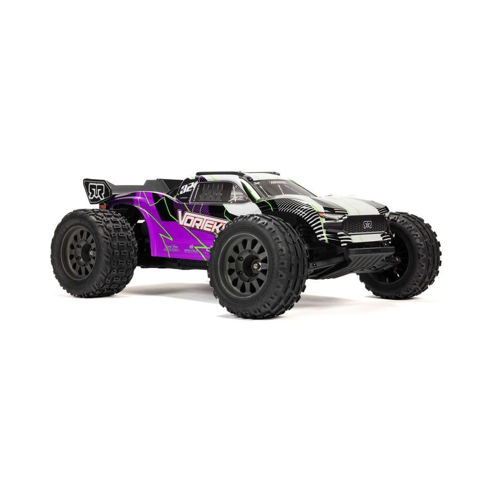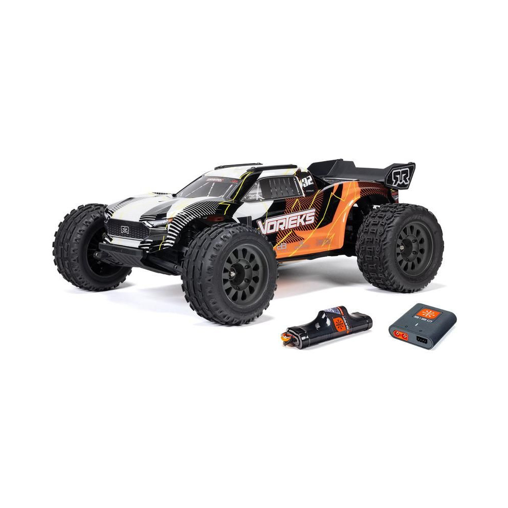 RC modell Arrma Vorteks Mega 550 1:10 RTR egy megfizethető távirányítós Truggy 2WD-vel, független felfüggesztéssel, olajcsillapítókkal, arányos kormányzással és DC motorral. SLT 2,4 GHz-es RC készlet. NiMH akkumulátor és USB-C töltő tartozék.