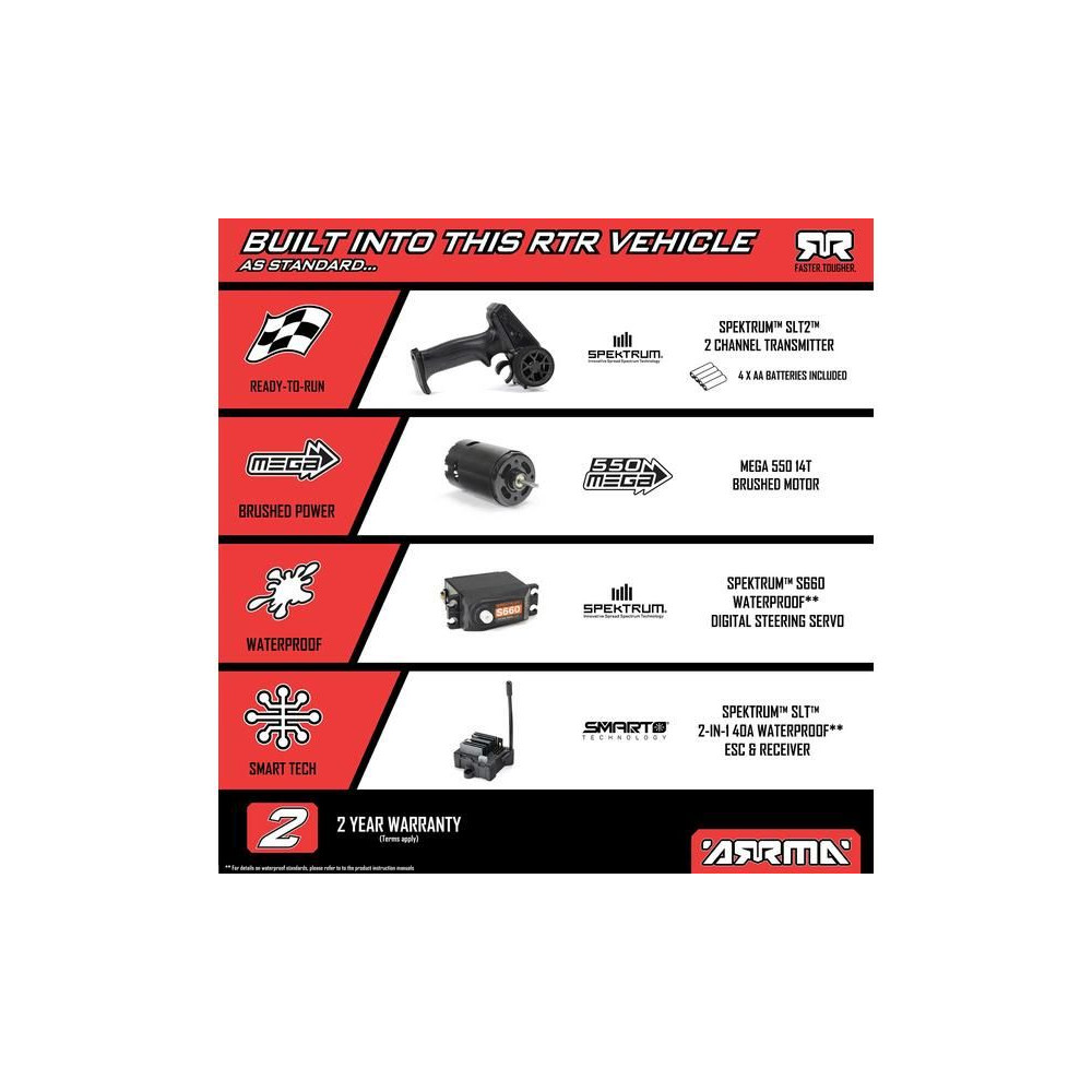 A Spektrum SLT jeladó biztonságos, üzembiztos működést biztosít, és lehetővé teszi a kezdők számára a teljesítmény 75%-ra vagy 50%-ra történő korlátozását. A gondtalan vezetés érdekében a modell vízálló* alkatrészeket használ - Spektrum 2-in-1 40A vevővezérlő és Spektrum S660 nagy nyomatékú szervóvezérlő.