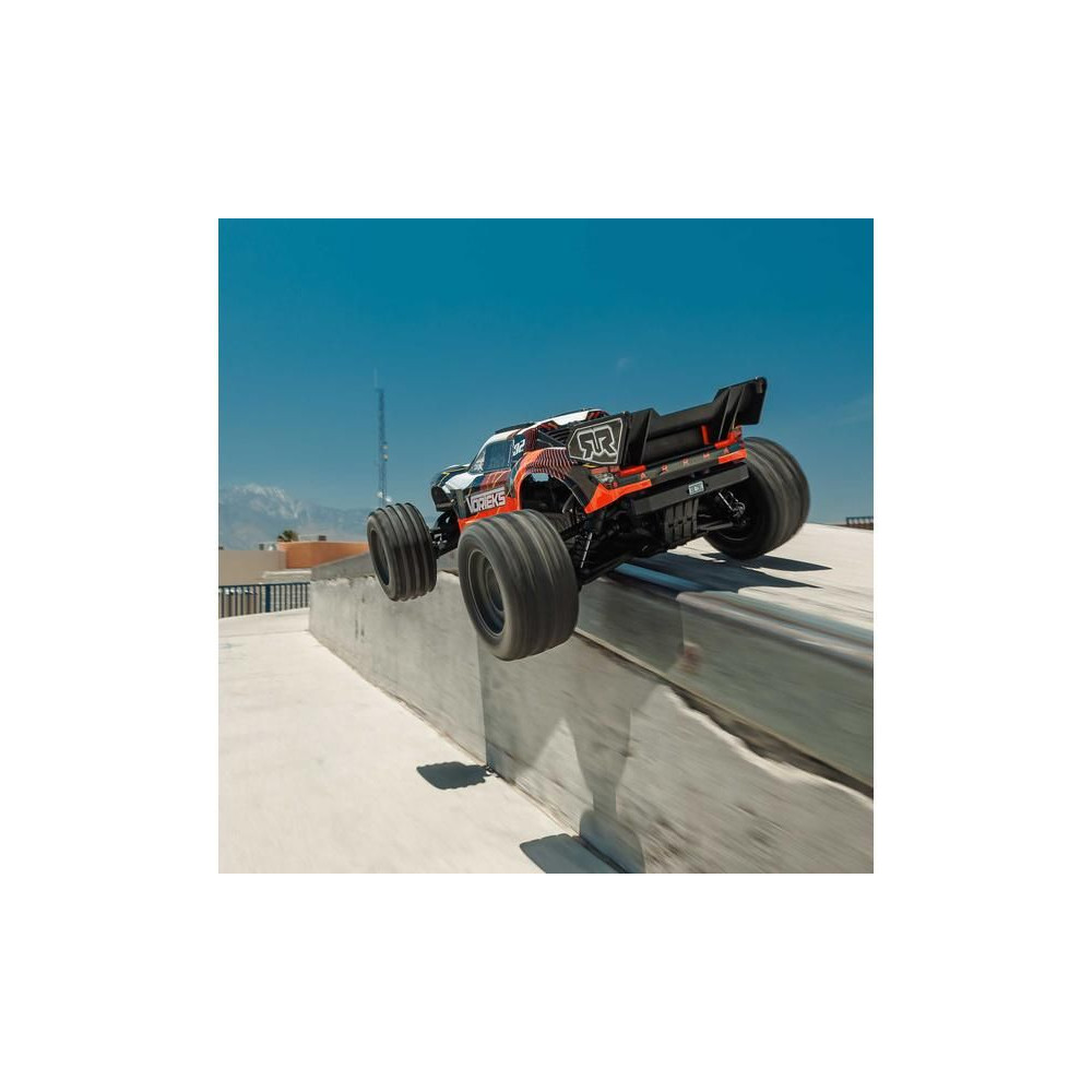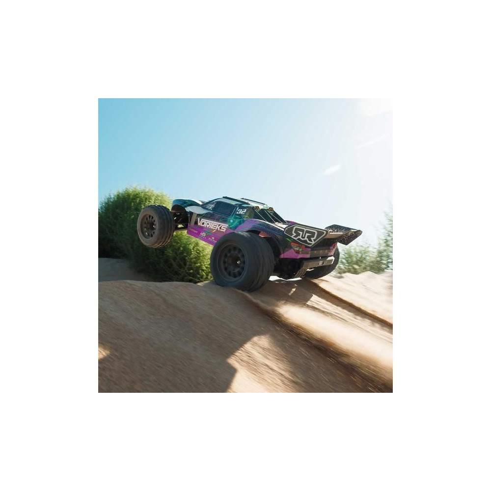 RC modell Arrma Vorteks Mega 550 1:10 RTR egy megfizethető távirányítós Truggy 2WD-vel, független felfüggesztéssel, olajcsillapítókkal, arányos kormányzással és DC motorral. SLT 2,4 GHz-es RC készlet. NiMH akkumulátor és USB-C töltő tartozék.