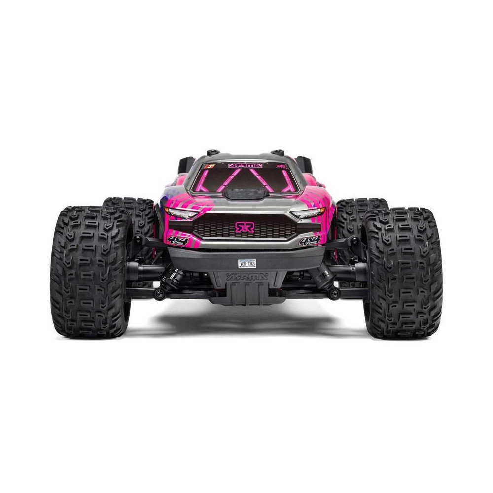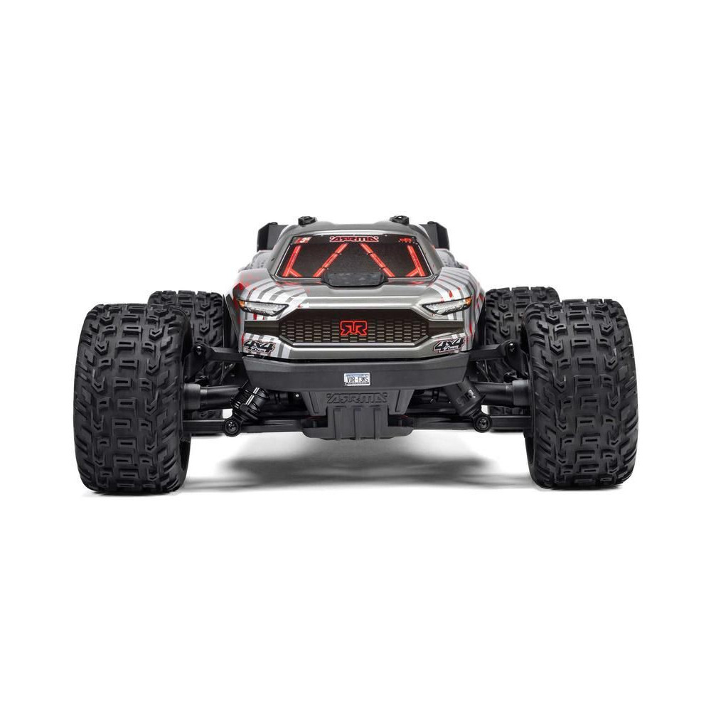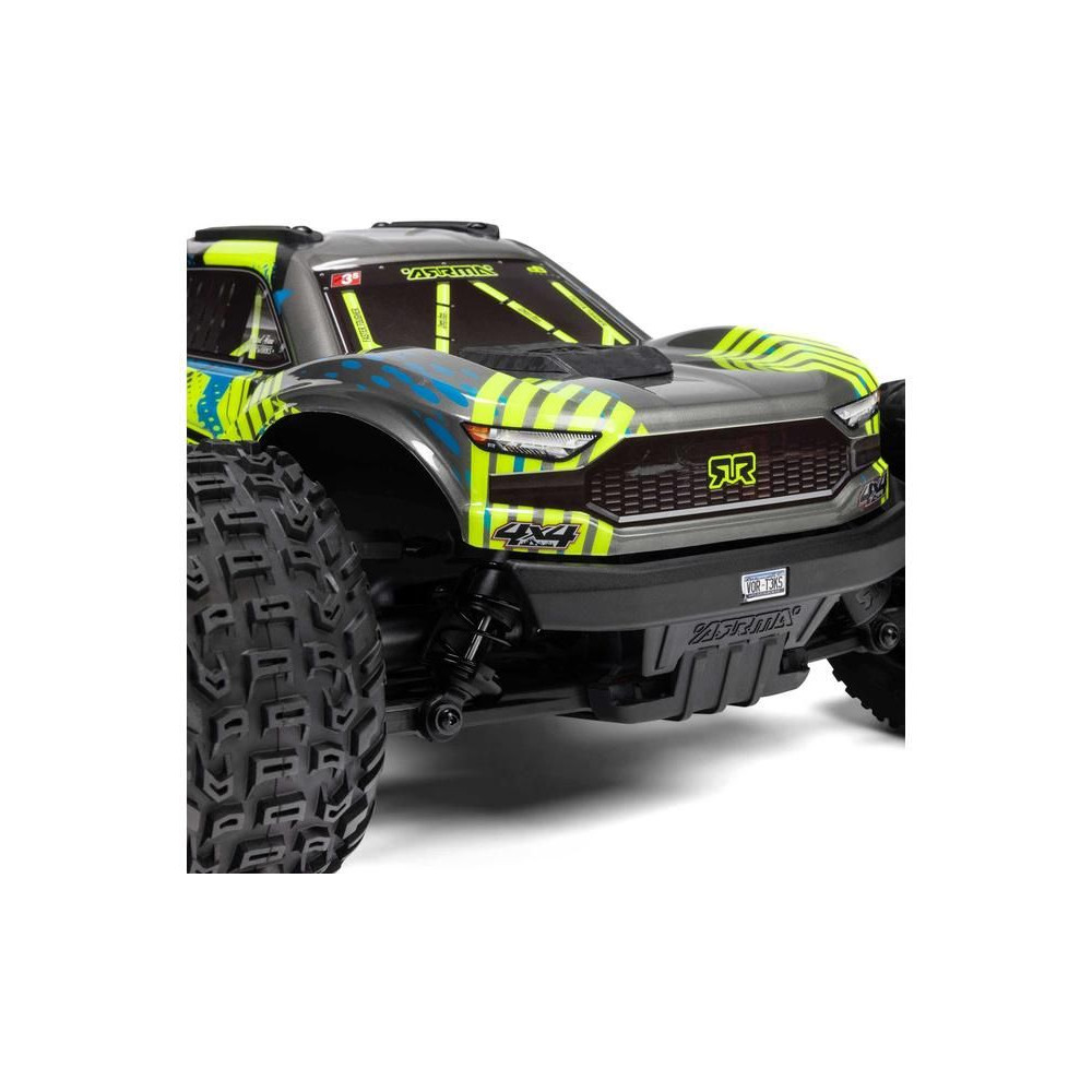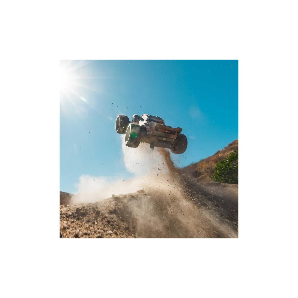 A bevált, tartós ARRMA® 4X4 platform lehetővé teszi a nagy sebességű vezetést szinte bármilyen környezetben – terepen, kavicson és füvön, parkolókban, valamint burkolt és aszfalt felületeken. Az alváz ellenállását az erős kompozit alváz és a megnövelt magasságú szennyeződésvédők biztosítják. A használt fém fogaskerekek kellően tartósak a váltakozó áramú meghajtáshoz. A teljesítmény az első és hátsó differenciálmű segítségével jut el az egyes kerekekhez. A maximális tapadást a bevált dBoots gumiabroncsok biztosítják. A Spektrum SLT adó biztonságos, meghibásodás nélküli működést biztosít, a gondtalan vezetés érdekében a modell vízálló* alkatrészeket használ - Spektrum 2 az 1-ben 85A-es vevőszabályozót és Spektrum S662 szervovezérlést nagy nyomatékkal és fém fogaskerekekkel.