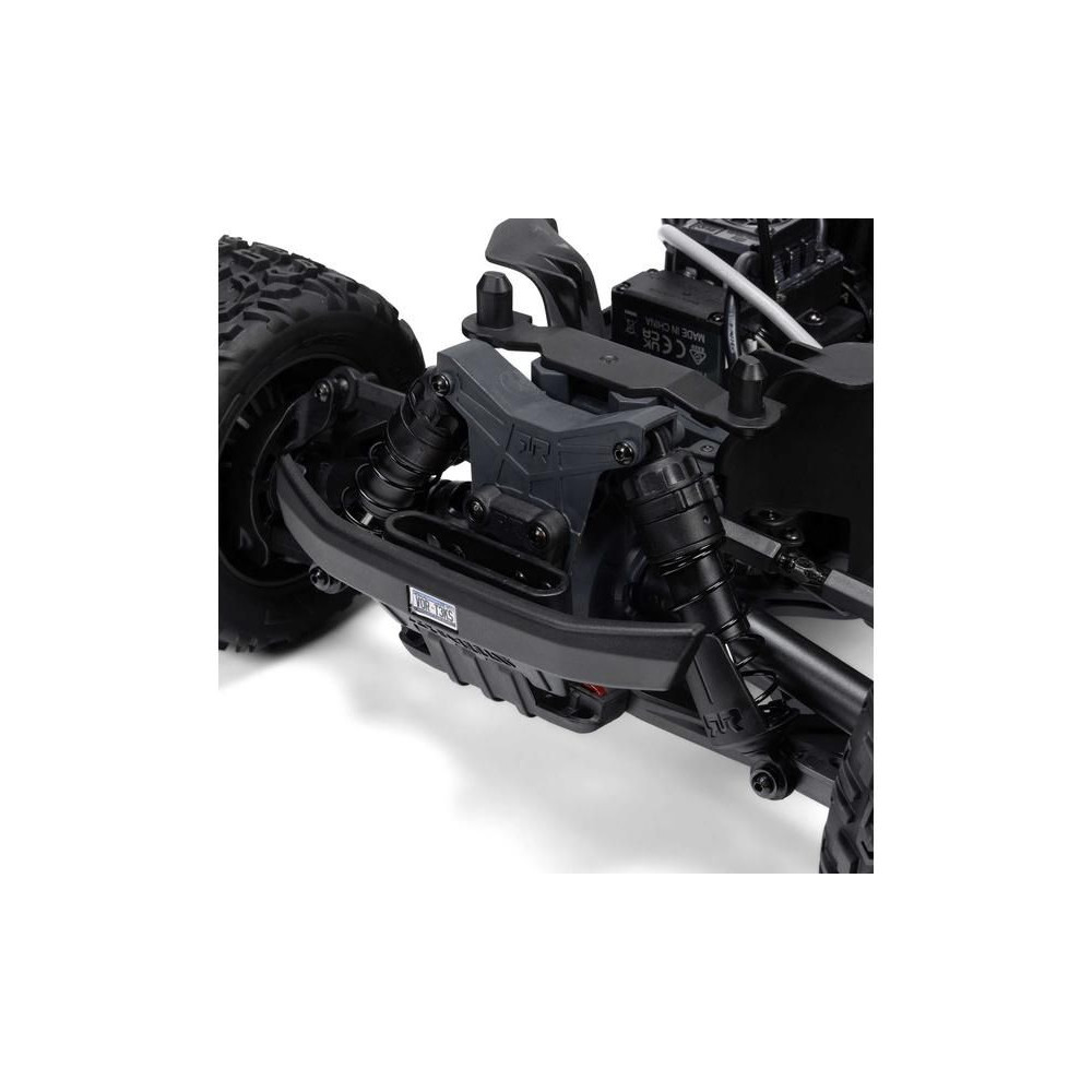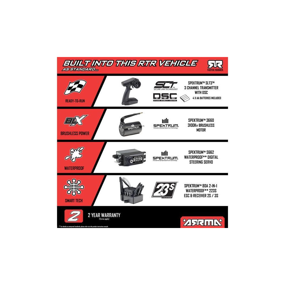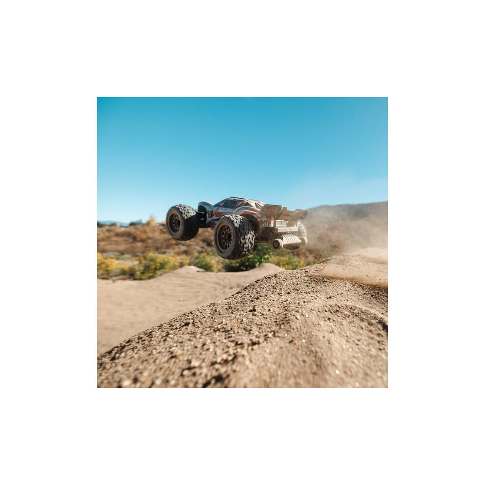 A bevált, tartós ARRMA® 4X4 platform lehetővé teszi a nagy sebességű vezetést szinte bármilyen környezetben – terepen, kavicson és füvön, parkolókban, valamint burkolt és aszfalt felületeken. Az alváz tartósságát az erős kompozit alváz és a megnövelt magasságú porvédők biztosítják. A használt fém fogaskerekek kellően tartósak a váltakozó áramú meghajtáshoz. A teljesítmény az első és hátsó differenciálmű segítségével jut el az egyes kerekekhez. A maximális tapadást a bevált dBoots gumiabroncsok biztosítják. A Spektrum SLT adó biztonságos, meghibásodás nélküli működést biztosít, a gondtalan vezetés érdekében a modell vízálló* alkatrészeket használ - Spektrum 2 az 1-ben 85A-es vevőszabályozót és Spektrum S662 szervovezérlést nagy nyomatékkal és fém fogaskerekekkel.