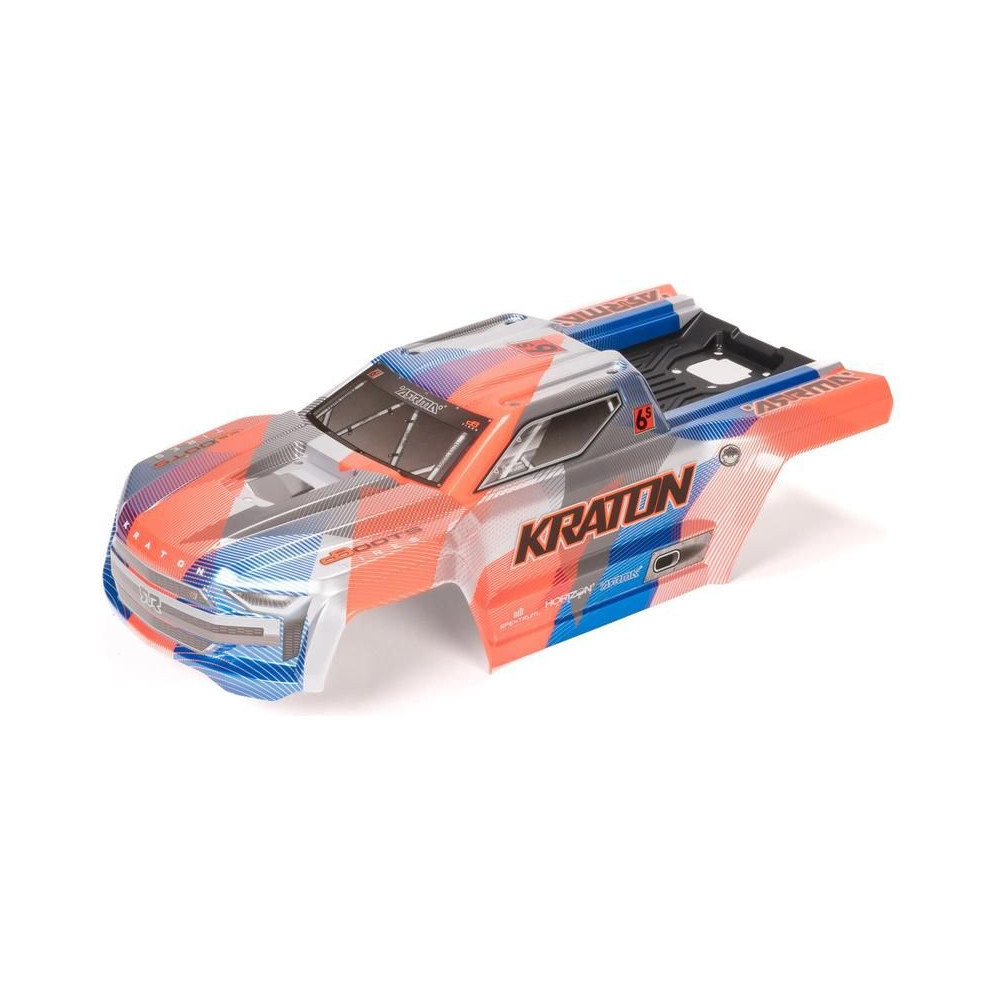Alkatrész Arrma 1:8 Kraton 6S BLX V6 RC autómodellekhez: kék/narancssárga karosszéria. Polikarbonát test, szegélyezve a könnyű összeszerelés érdekében. Klip nélküli rögzítőrendszerhez tervezve. A karosszéria-rögzítő készlet nem része a csomagnak.