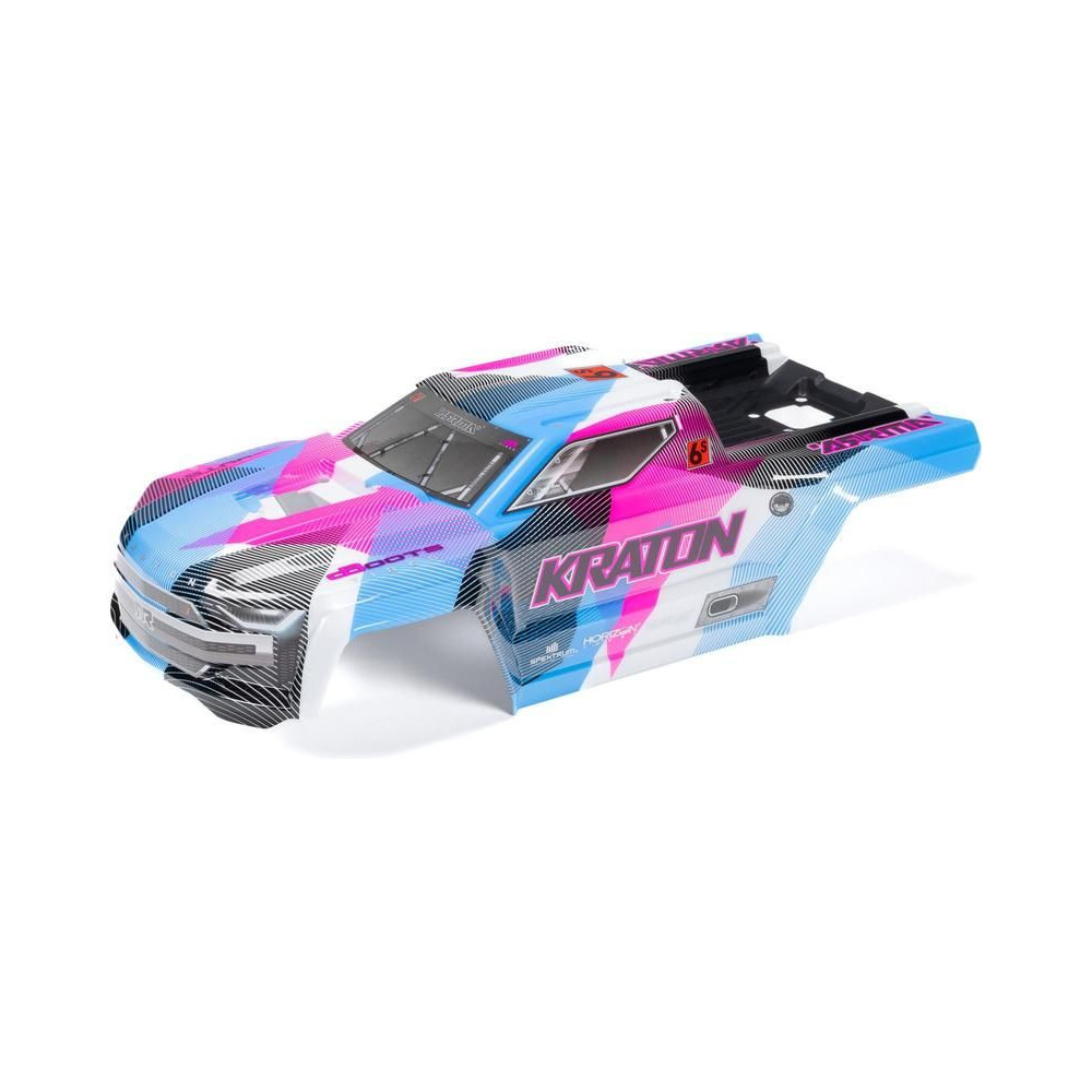 Alkatrész Arrma 1:8 Kraton 6S BLX V6 RC autómodellekhez: karosszéria kék/rózsaszín. Polikarbonát test, szegélyezve a könnyű összeszerelés érdekében. Klip nélküli rögzítőrendszerhez tervezve. A karosszéria-rögzítő készlet nem része a csomagnak.