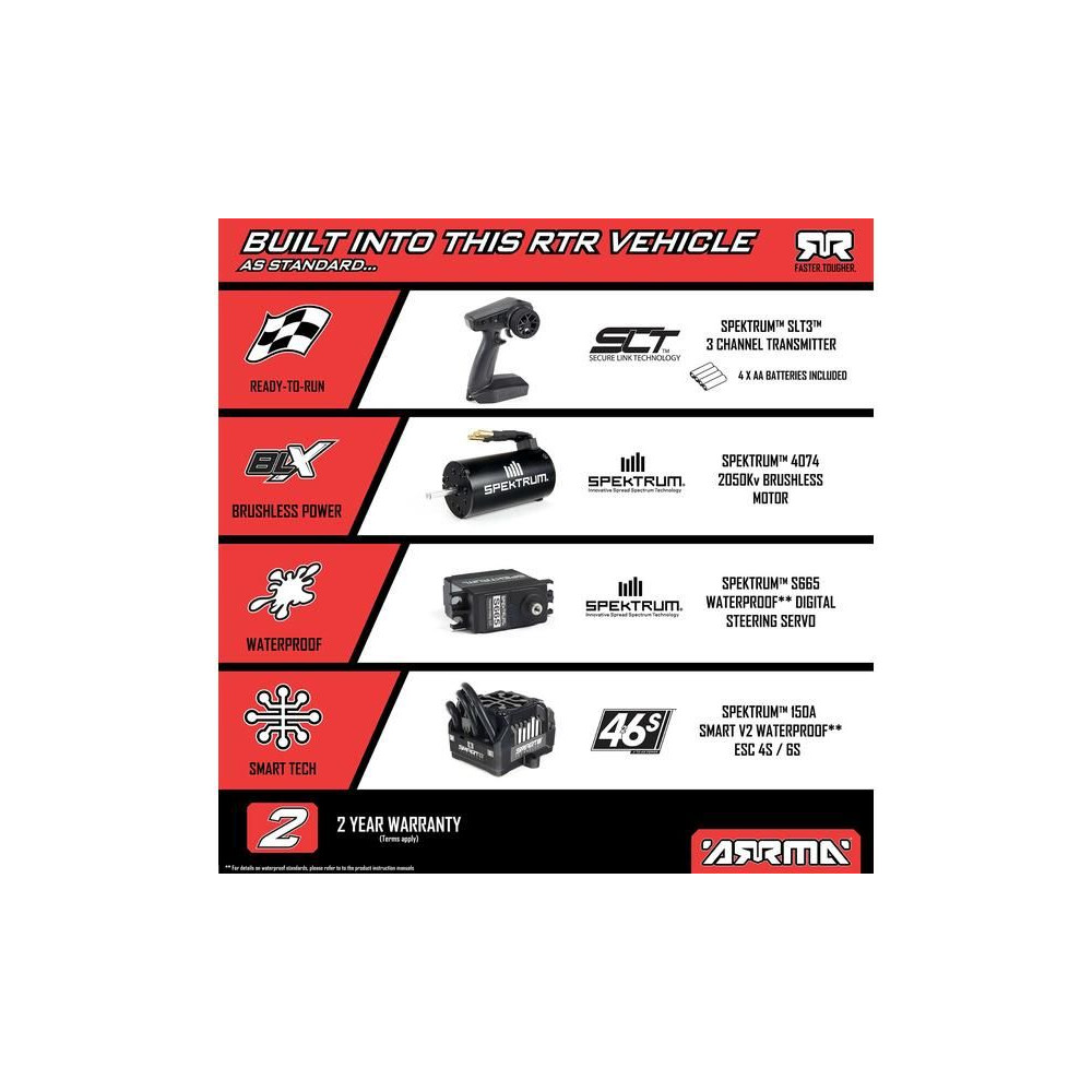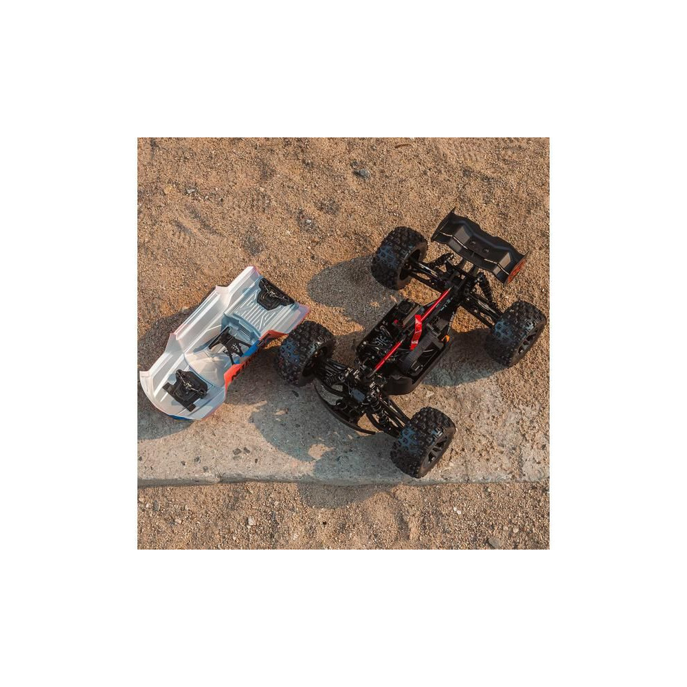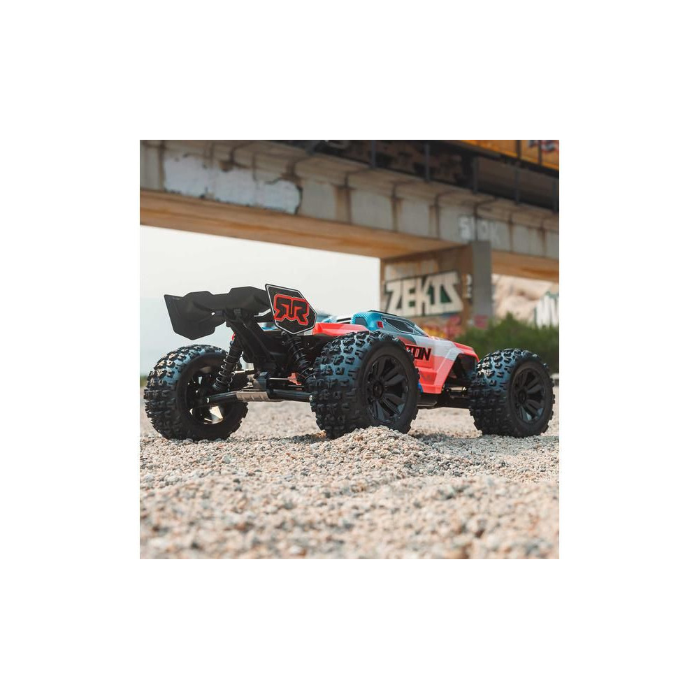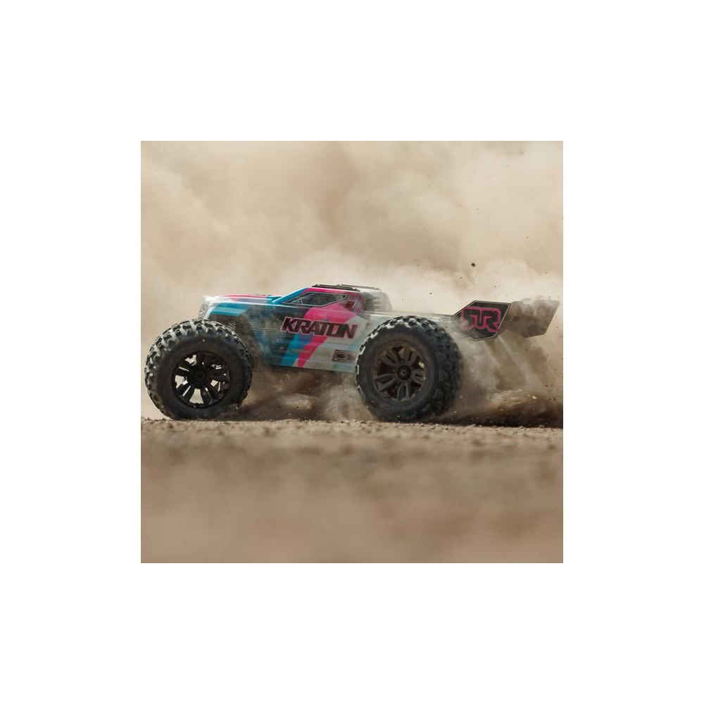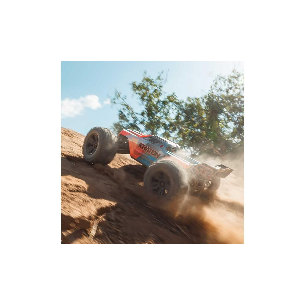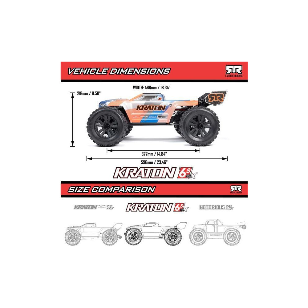 A legendás Arrma Kraton 6S BLX RC modellautó új, 1:8 méretarányú V6-os változata , amely lenyűgöző sebességét és erejét a következő szintre emeli, és kulcsfontosságú fejlesztéseket tartalmaz a tartósság érdekében. A féktelen vezetés érdekében nagy szilárdságú EXB (Extreme Bash) alkatrészeket szereltek be . Az extra erős AC motor lehetővé teszi a modell számára, hogy akár 104 km/h sebességet is elérjen. Komplett elektronika beépítve egy új Spektrum Firma V2 szabályozóval, egy fém fogaskerekes szervóval és egy vevővel. A kiváló aszfalt- és terepjárási vezetési tulajdonságokat a széles nyomtávú független felfüggesztés és a differenciálművekkel ellátott, hangolt 4x4-es hajtás garantálja. A test patent nélküli a gyors és egyszerű összeszerelés és szétszerelés, valamint a patent nélküli letisztult megjelenés érdekében.