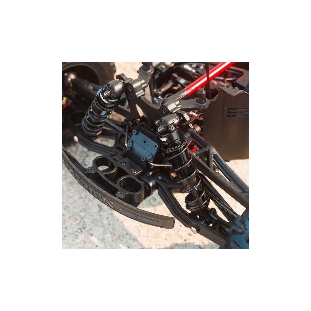 Az RC modell 16 mm-es olajjal töltött alumínium lengéscsillapítókkal rendelkezik, amelyek még az erős ütéseket is elnyelik, miközben vezetés közben maximális érintkezést biztosítanak a felülettel, így maximális kontrollt biztosítva. A hasmagasság, vagy rugó-előfeszítés, könnyen állítható egy anya segítségével.
