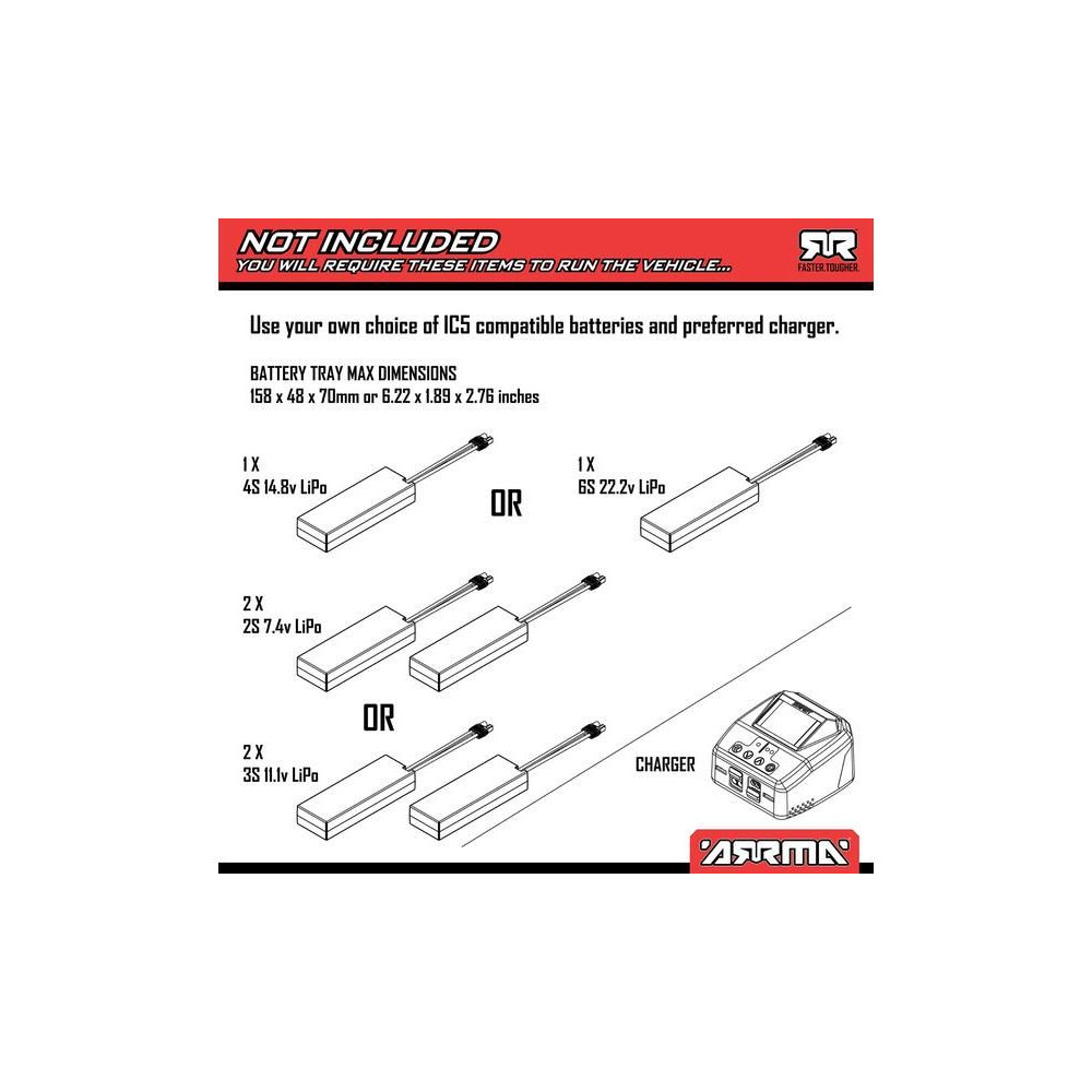 Mivel a hálózati hajtás 4-6S LiPo akkumulátorokhoz van méretezve, a kezdetektől fogva 4S LiPo akkumulátorral (külön megvásárolható) vezethetsz, és amint a vezetési képességeid javulnak, csatlakoztathatsz egy 6S LiPo akkumulátort (külön megvásárolható) a modellhez, és akár extrém 96 km/h-ra is növelheted a teljesítményt és a sebességet. További funkció a gáz 75%-ra vagy 50%-ra korlátozásának lehetősége az adón, így a modell kevésbé tapasztalt sofőröknek is alkalmas. Ez a modell mindent meg tud csinálni - a gyors vezetéstől a terepen és szilárd talajon át a nagyszerű ugrásokig, hátraszaltókon át és sok másig.