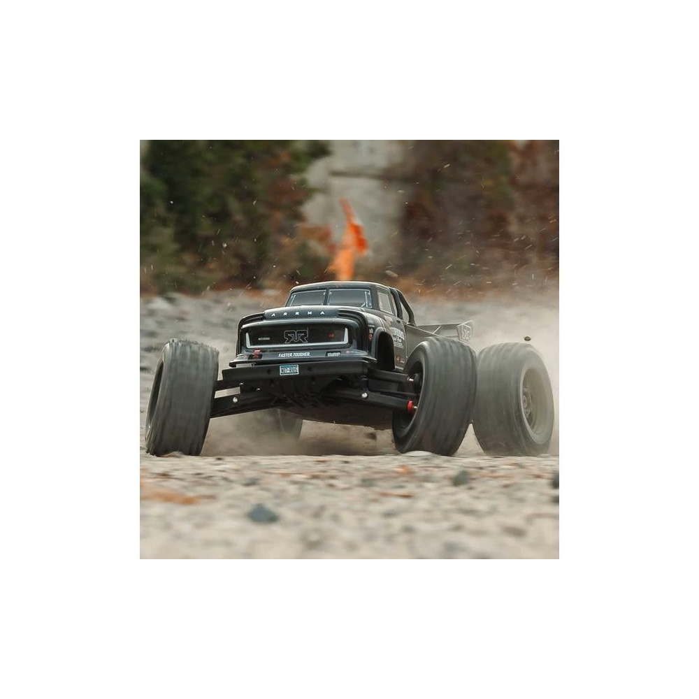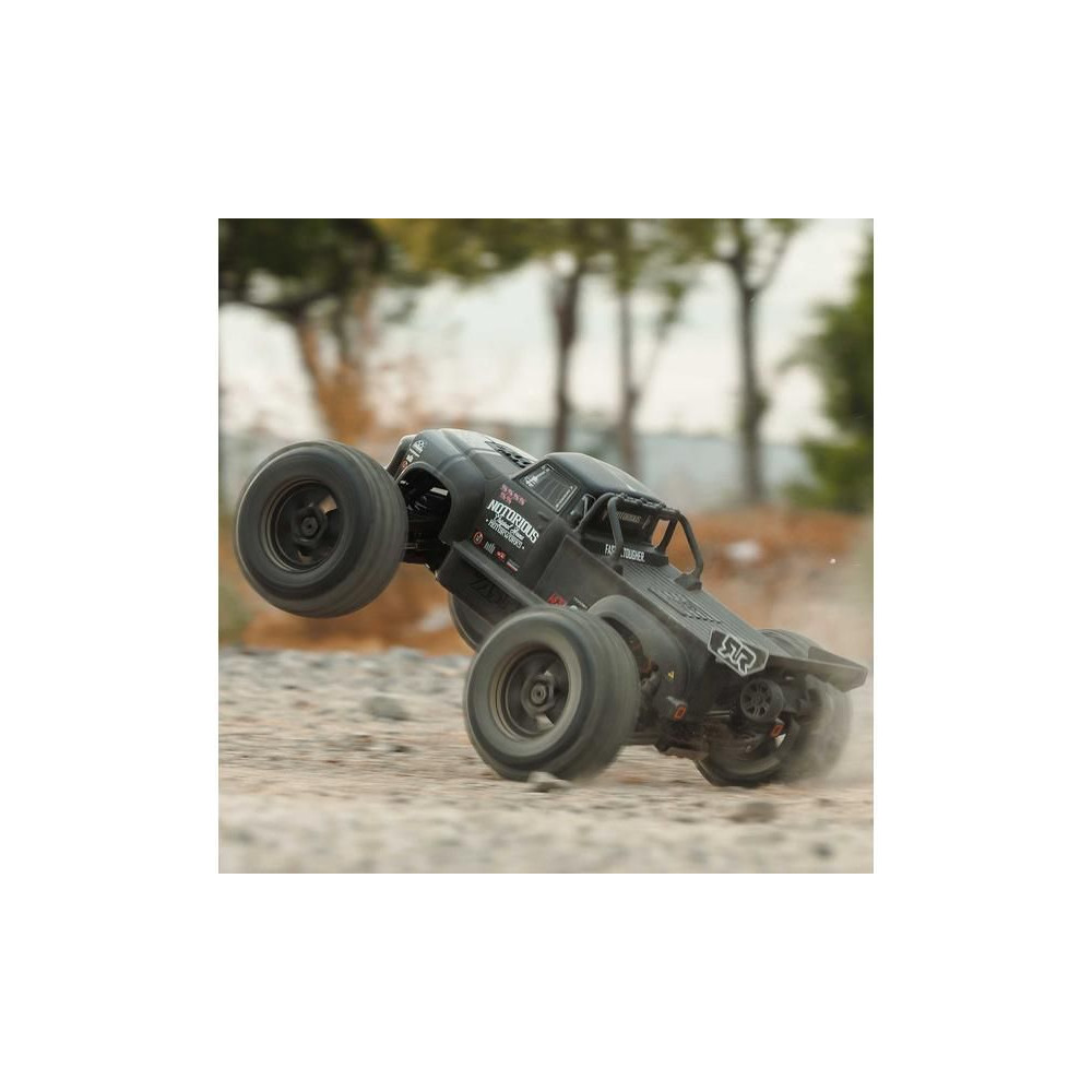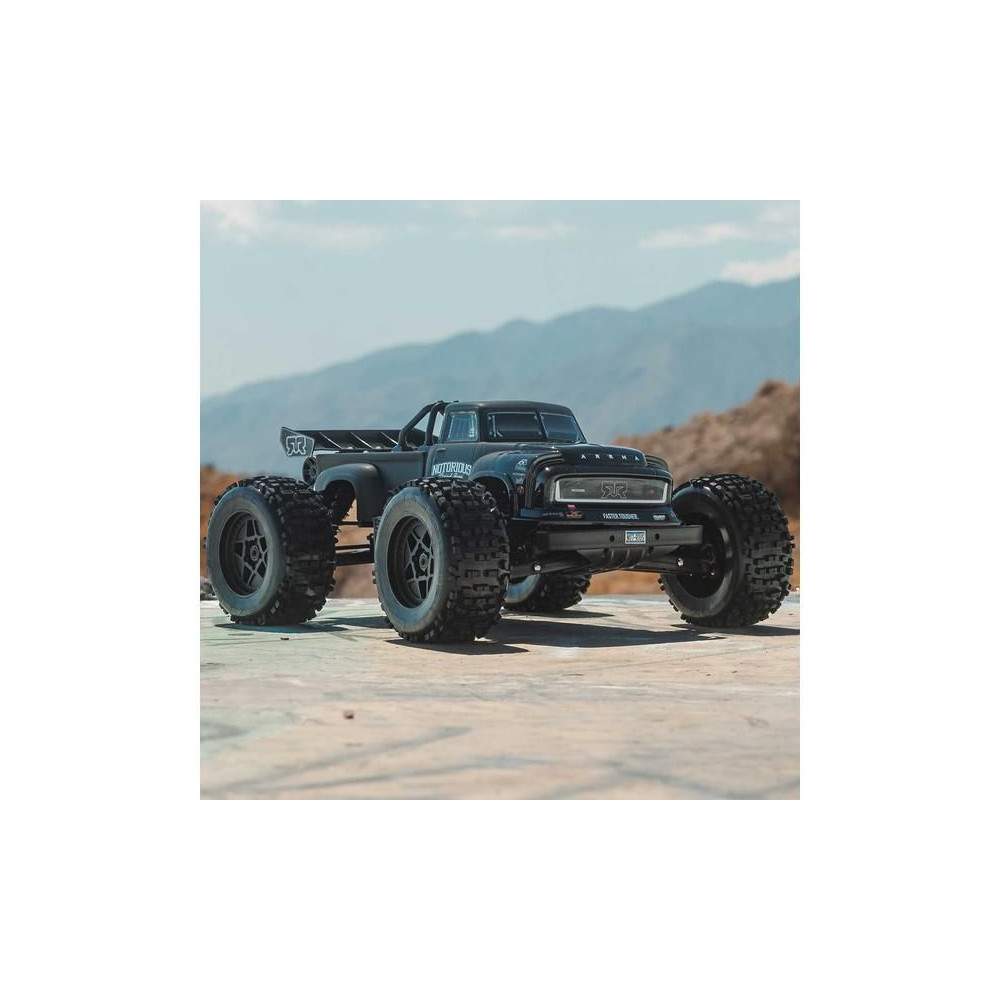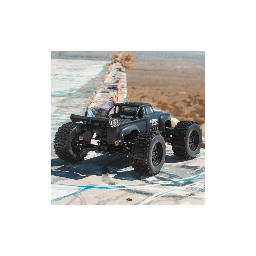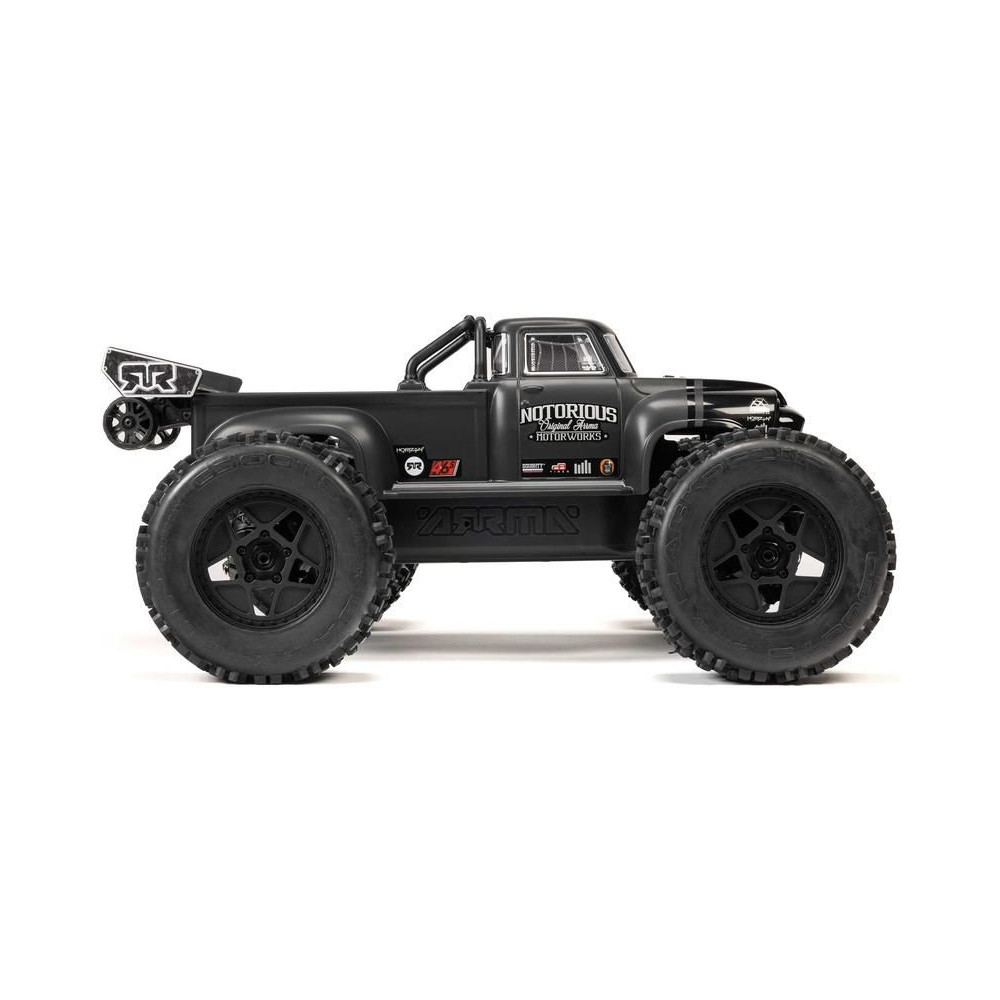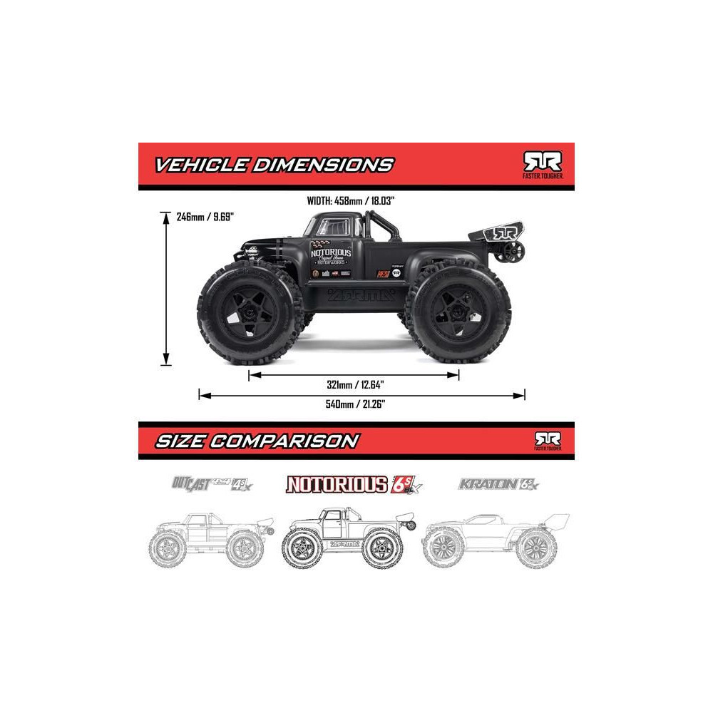 Az Arrma Notorious 6S BLX 1:8 méretarányú távirányítós modellautó új V6-os változata , amely lenyűgöző sebességét és erejét a következő szintre emeli, és kulcsfontosságú fejlesztéseket tartalmaz a tartósság érdekében. Ennek köszönhetően még jobb és merészebb mutatványokat hajthatsz végre , a modell erre készült a rövid tengelytávnak köszönhetően. A féktelen vezetés érdekében nagy szilárdságú EXB (Extreme Bash) alkatrészeket szereltek be . Az extra erős AC motor lehetővé teszi a modell számára, hogy akár 96 km/h sebességet is elérjen. Komplett elektronika beépítve egy új Spektrum Firma V2 szabályozóval, egy fém fogaskerekes szervóval és egy vevővel. A kiváló vezetési tulajdonságokat aszfalton és terepen a független felfüggesztés és a differenciálművekkel ellátott, hangolt 4x4-es hajtás garantálja. A második világháborús repülőgépek ihlette retró megjelenésű test stoplik nélküli a gyors és egyszerű összeszerelés és szétszerelés, valamint a stoplik nélküli tiszta vonalak érdekében.