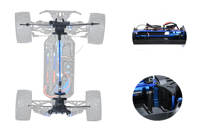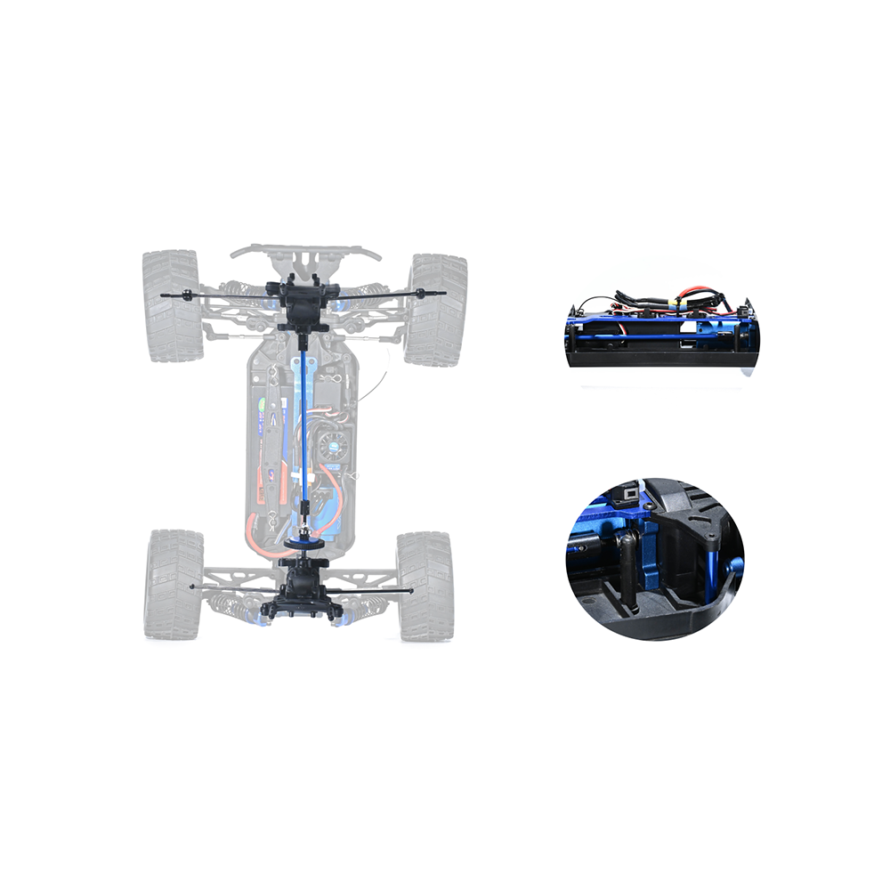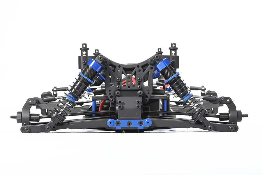 Az alvázat alumínium felső lemezzel és lengőkar-felfogatásokkal erősítették meg, amelyek javítják a merevséget és a kormányzási pontosságot. Az állítható keménységű olajos lengéscsillapítók simán elnyelik az egyenetlenségeket, és stabil menetet biztosítanak még nehéz terepen is. A 4WD hajtásnak és az alacsony súlypontnak köszönhetően a modell kiváló tapadással és megbízható kezelhetőséggel rendelkezik nagy sebességnél.