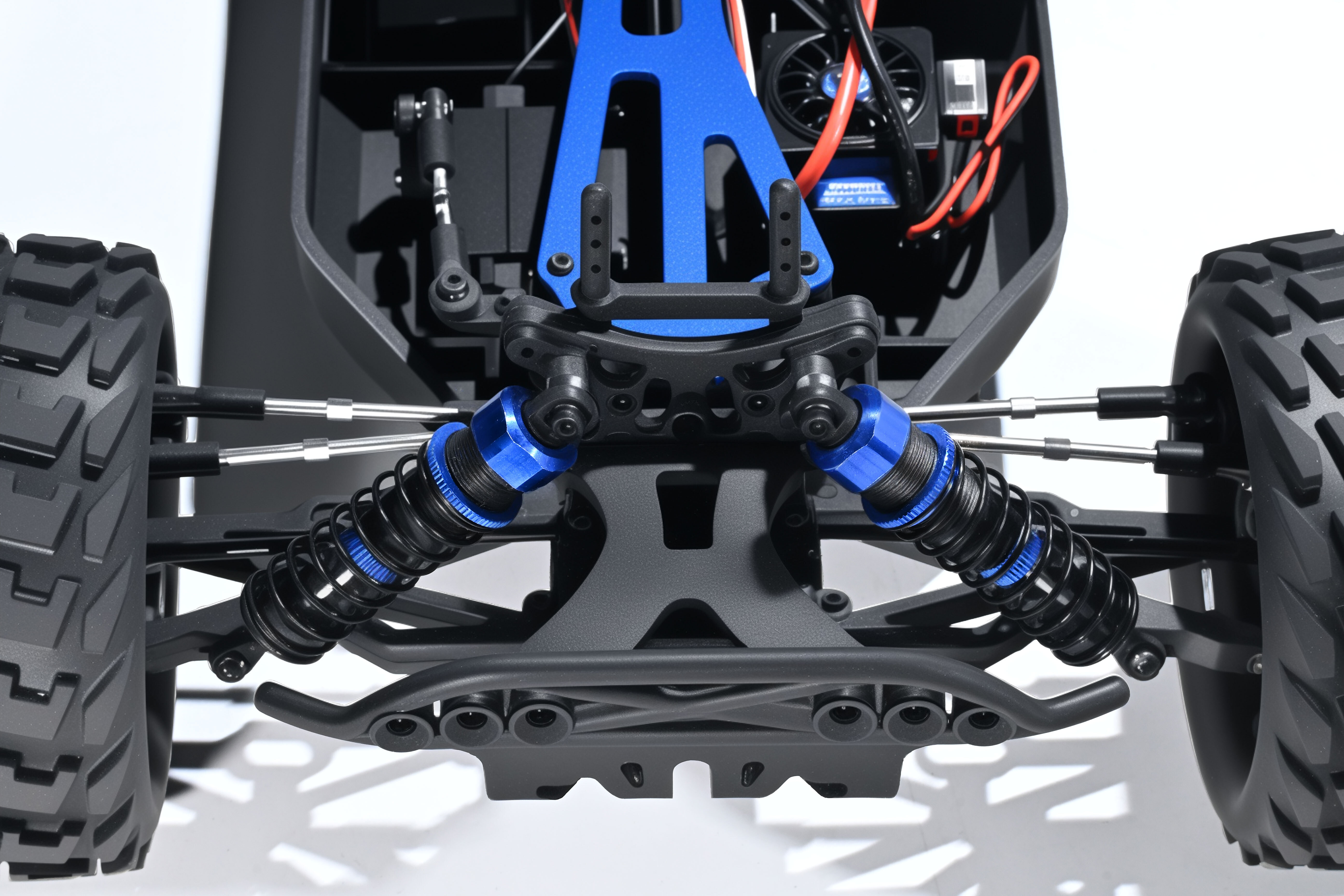 Az alváz strapabíró nejlonból készült és alumínium felső lemezekkel van megerősítve, így ugrások és kemény landolások során sem csavarodik. A tartós műanyagból készült hátsó szárny stabilizálja az autót nagyobb sebességnél, miközben védi a hátsó részt. Az első lökhárítót úgy tervezték, hogy elnyelje az ütéseket – és opcionálisan LED világítással is felszerelhető az esti szórakozáshoz.
