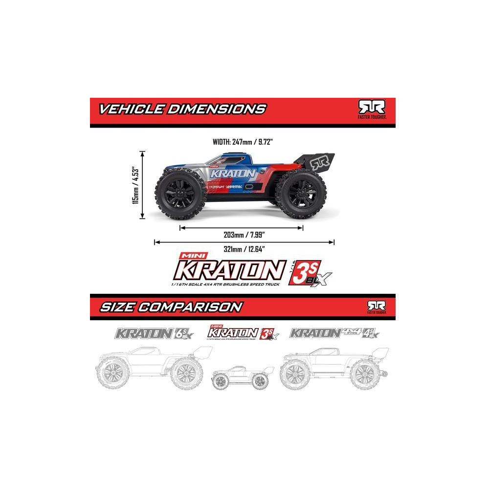 A Mini Kraton 3S 1:16 egy kicsi, szórakoztató és hihetetlenül erős RC modell. A PowerGuard technológia sokoldalú használatot tesz lehetővé mind a kezdők, mind a tapasztalt motorosok számára, a lassabb, hosszabb utakon (30 km/h, 30 perc) egészen a 80 km/h feletti sebességig. Tartós váz, 4x4 hajtás, DSC stabilizálás . 3S LiPo akkumulátorral és USB töltővel.