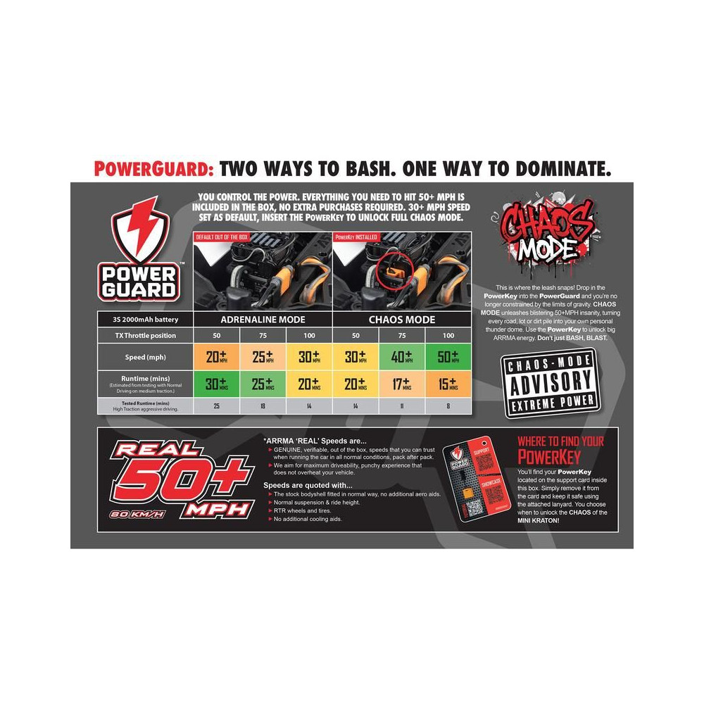 A PowerGuard technológia lehetővé teszi a teljes sebességtartományban történő vezetést a vezető tapasztalatának megfelelően, és meghosszabbítja a vezetési időt. Nem kell többé gyengébb 2S LiPo akkumulátorral rendelkeznie a csendesebb vezetéshez, és erősebb 3S LiPo akkumulátorral a teljes teljesítményhez. A PowerGuard segítségével csak egy 3S LiPo akkumulátorra van szüksége (külön megvásárolható), és alap "adrenalin" módban akár 48 km/h sebességet is elérhet, akár 20 perces vezetési idővel. Ha ez túl sok, például gyermekek számára, a jeladón a gázkorlát 75%-ra, vagy 50%-ra csökkenthető 30 km/h sebességhez és 30 perces üzemidőhöz. Fordítva, ha már kellően képzett vezetési képességei vannak, aktiválja a "Káosz" módot a mellékelt PowerKey vezérlőbe helyezésével, és oldja fel a teljes teljesítményt és az akár 80 km/h sebességet. (A PowerKey biztosítékként szolgál, és ugyanakkor könnyedén aktiválhatja a Káosz módot a behelyezésével.)
