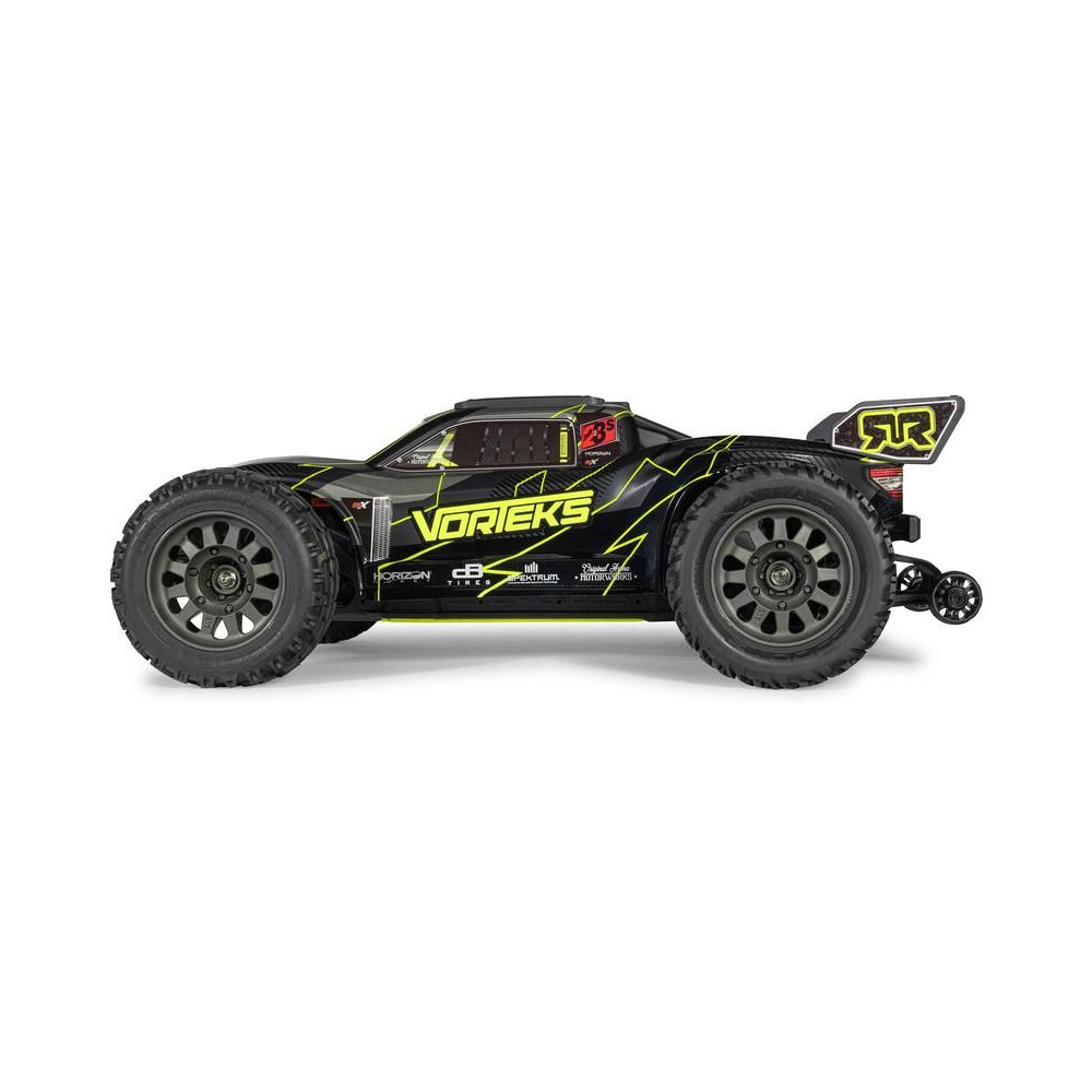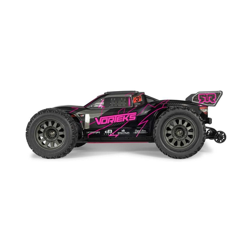 A Vorteks a népszerű truggy modellek klasszikus kialakításával rendelkezik, amely lehetővé teszi, hogy szinte bármilyen környezetben versenyezzen - terepen, füvön, parkolóban és aszfaltfelületen. Széles kiállása javítja a kezelhetőséget nagy sebességnél. A kompozit alváz még az erős ütéseket is ellenállja. A használt fém fogaskerekek kellően tartósak a váltakozó áramú meghajtáshoz. A maximális tapadást elöl a bevált dBoots Dirtrunner, hátul pedig a dBoots Katar gumiabroncsok biztosítják. A Spektrum SLT adó biztonságos, meghibásodás nélküli működést biztosít, a gondtalan vezetés érdekében a modell vízálló* alkatrészeket használ - egy Spektrum 2 az 1-ben 45A vevővel ellátott szabályozót és egy nagy nyomatékú Spektrum S681 szervo vezérlést.