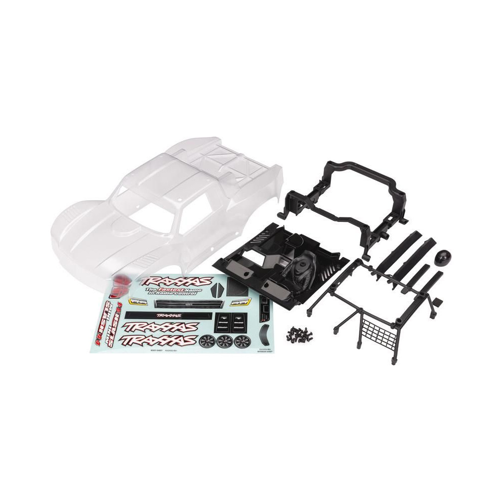 1:12-es Traxxas Mini Slash távirányítós modellautó alkatrész: Mini Slash átlátszó karosszéria. Festést és felületkezelést igényel. Tartalmazza a vezetőfülke alkatrészeit és a rögzítőelemeket. Matricalap.