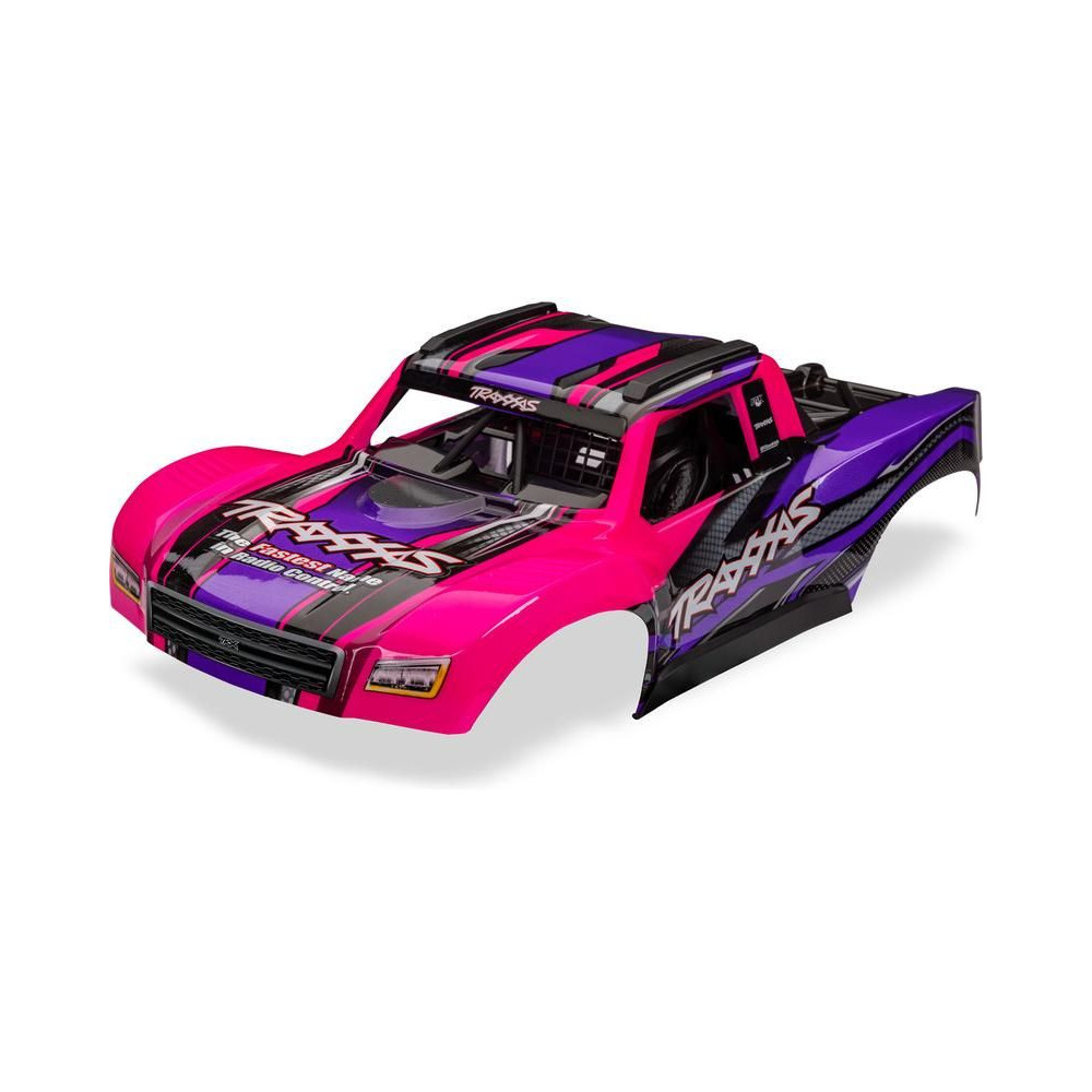1:12-es Traxxas Mini Slash RC modellautó alkatrész: Mini Slash rózsaszín karosszéria. Kész, festett és összeszerelt karosszéria, beleértve a beépített vezetőfülkét és a rögzítőkonzolt.