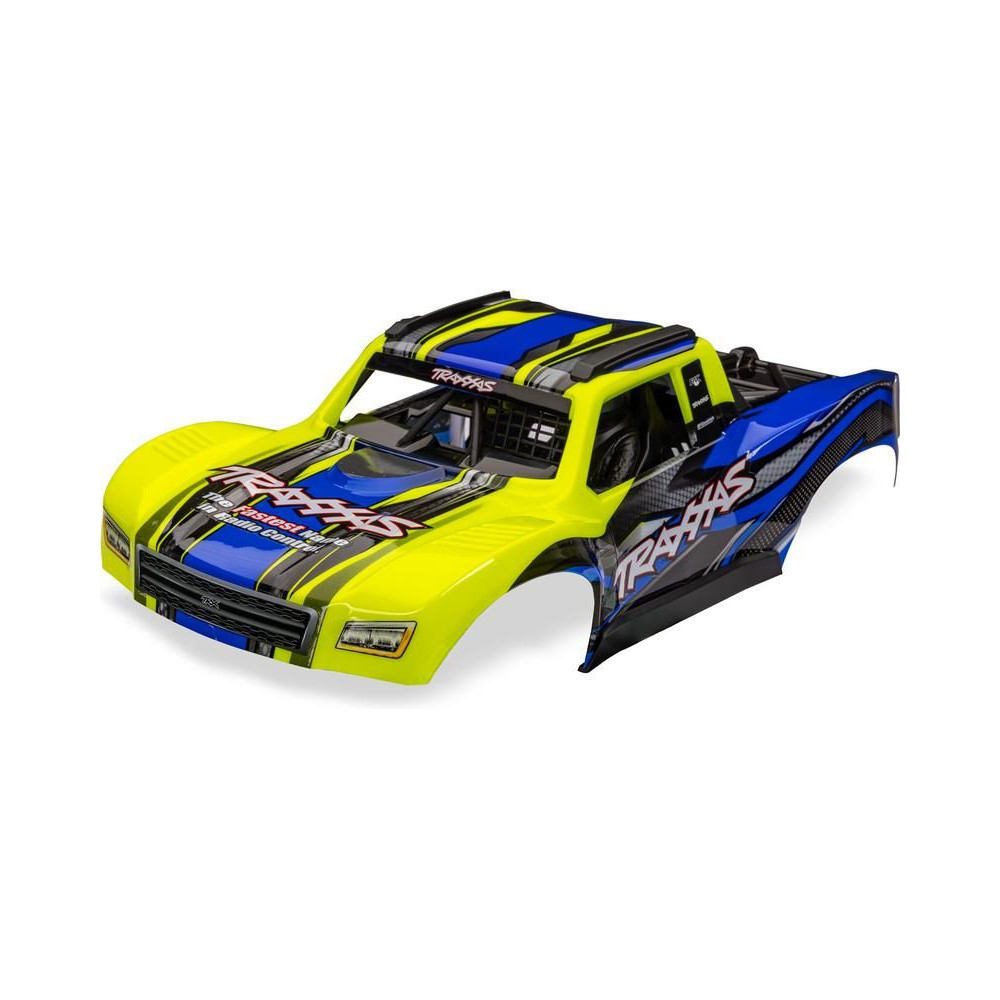 1:12-es Traxxas Mini Slash RC modellautó alkatrész: sárga Mini Slash karosszéria. Kész, festett és összeszerelt karosszéria, beleértve a beépített vezetőfülkét és a rögzítőkonzolt.