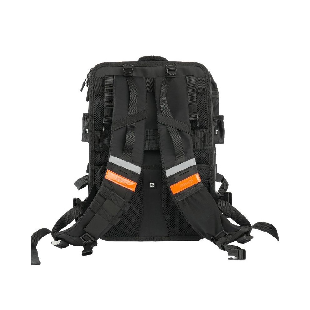 - A hátizsák tartalmaz egy MOLLE-ihlette tárolórekeszt, amely 4 oszlopban és 7 sorban elhelyezett rugalmas pántokból áll, és amely kényelmesen és egyértelműen elfér a "mindennapos hordozható" tárgyak (azaz a mindennapi tárgyak - szerszámok, zseblámpák stb.)
