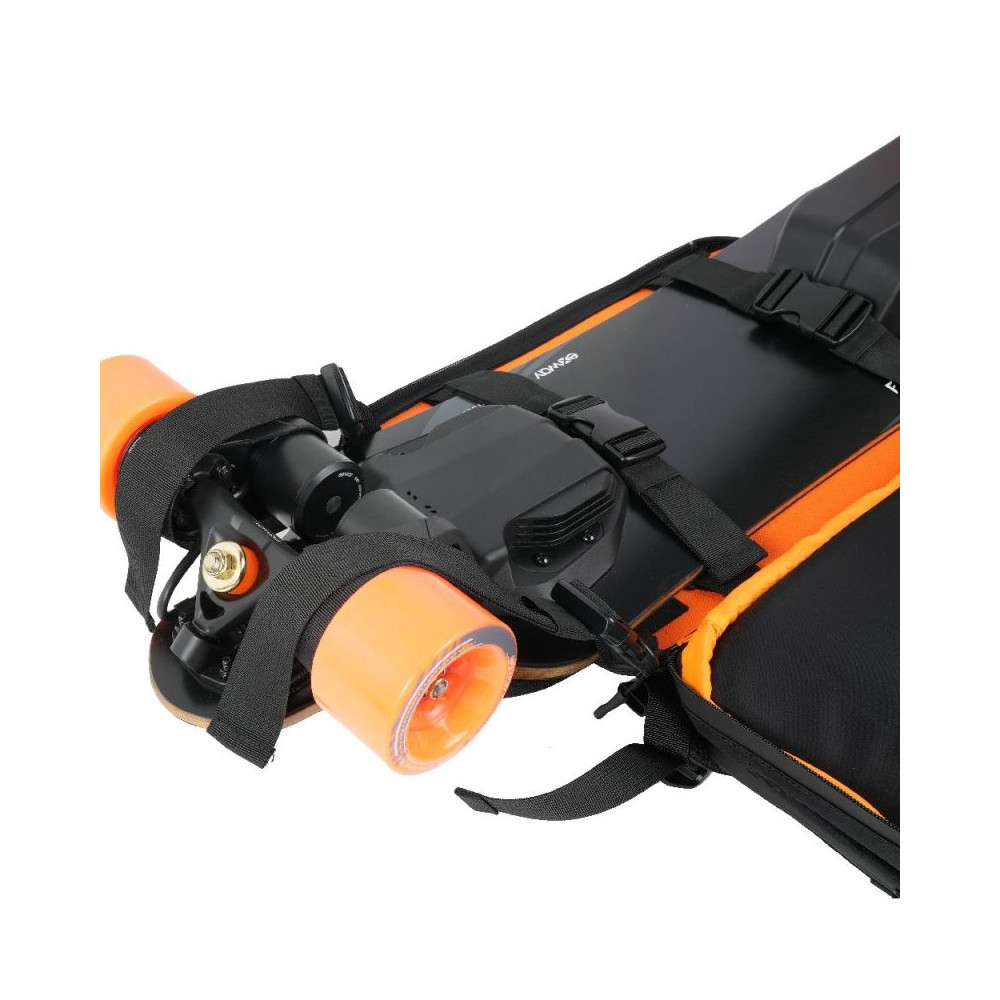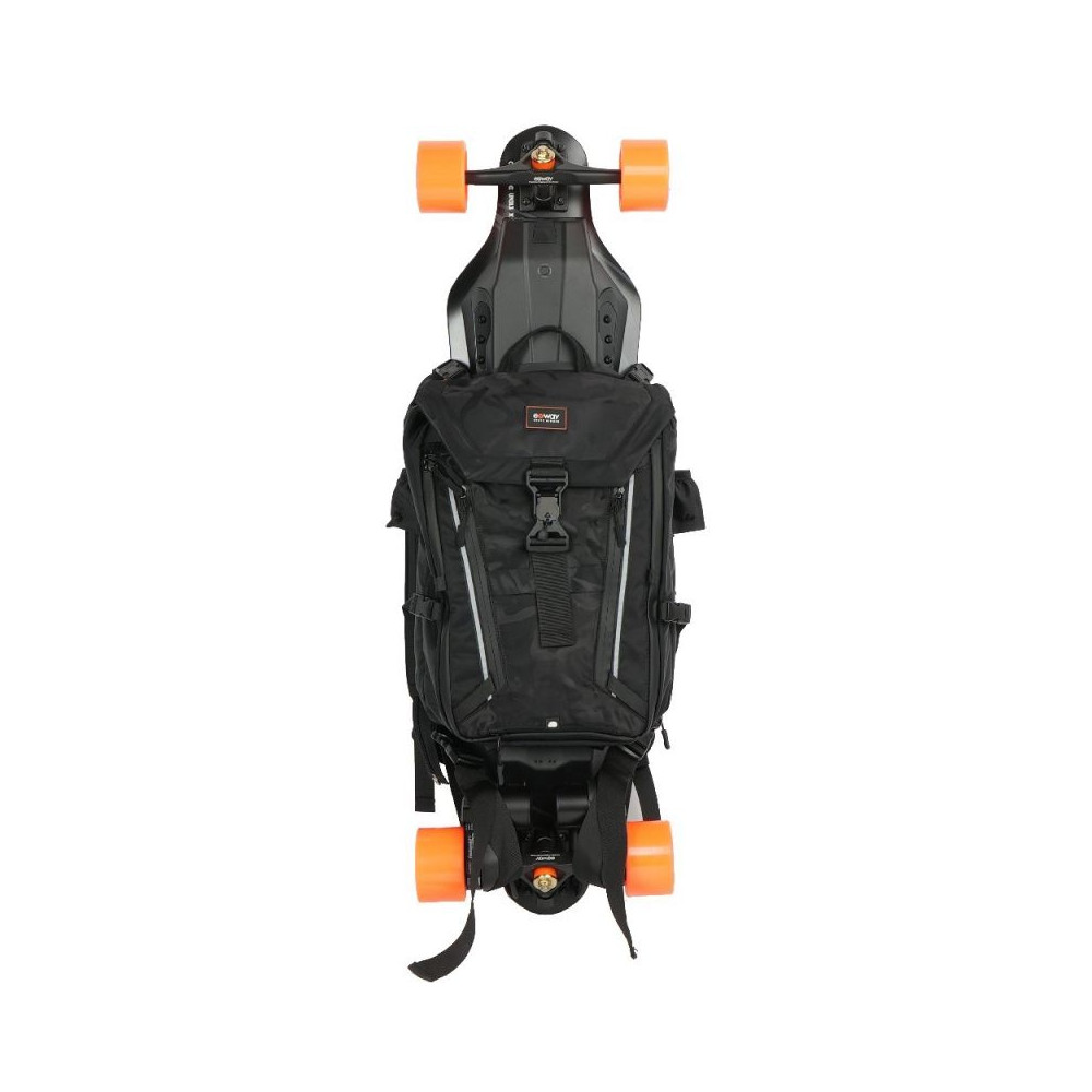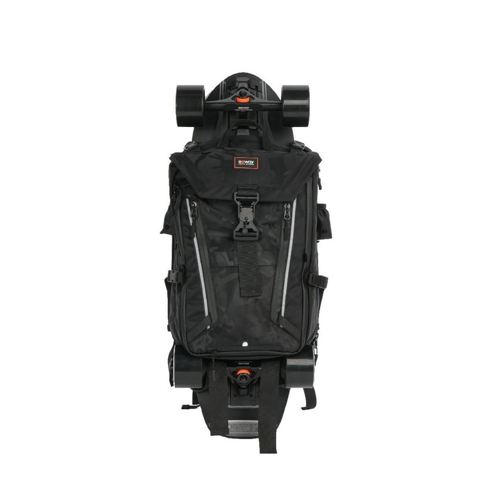 - Speciális külön zseb a gördeszka/hosszú deszka számára (függőleges pántok az alulról a teherautóknál történő rögzítéshez és vízszintes pántok a deszka rögzítéséhez a hátizsák edzett hátsó falához). A hevederek egyedi készítésű poliacetil csatokkal rendelkeznek a deszka rögzítéséhez a csomag belsejében (a csatok 50 kg terhelésre vannak méretezve).