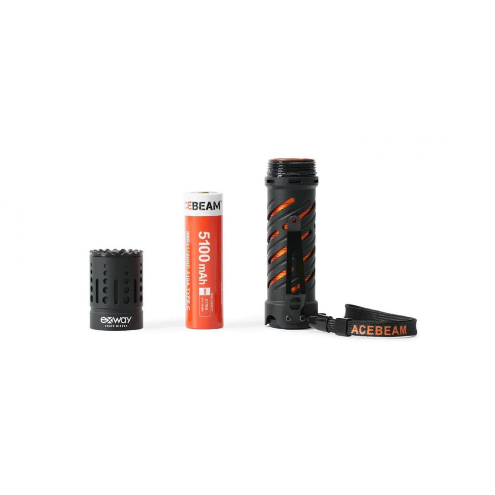 Alumínium EDC zseblámpa az Acebeam gyártótól. Maximális fénykibocsátás 4600 lumen. Hatótávolság 240 méter, nagyon széles fénykúp. Az akkumulátor élettartama maximális teljesítmény mellett 1,5 óra. A zseblámpa 21700-as akkumulátorcsomagot tartalmaz 5100 mAh kapacitással és beépített USB-C porttal az újratöltéshez. Vízálló 2 méteres mélységig.