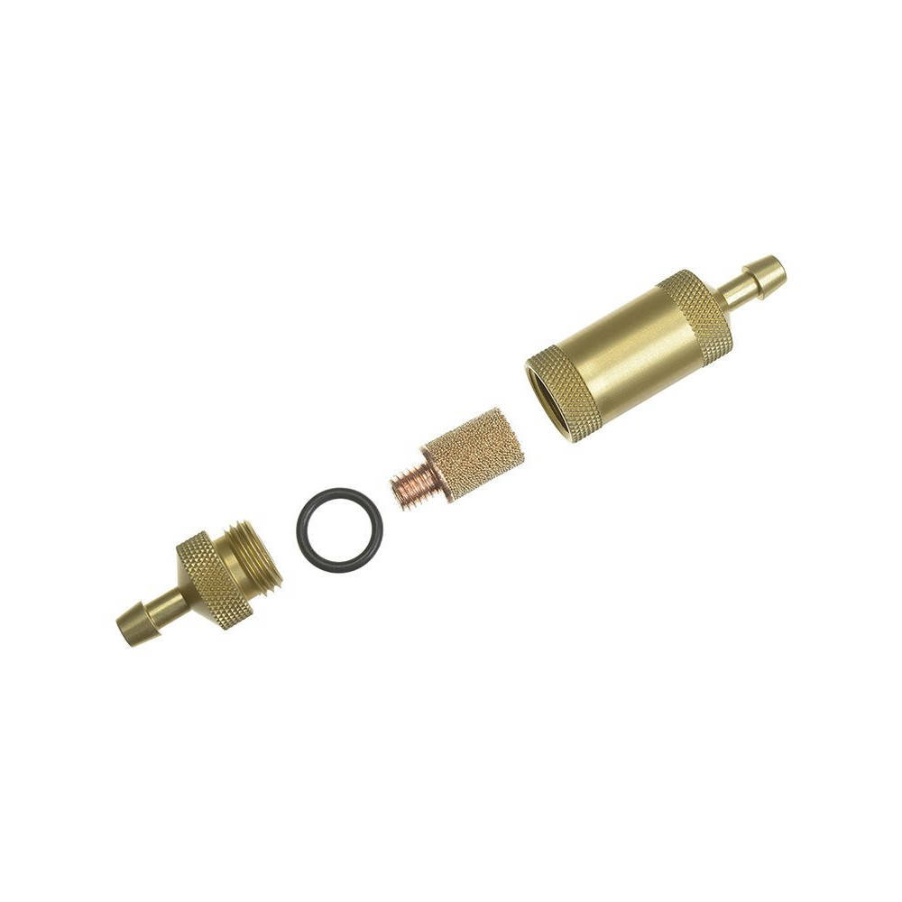 Üzemanyagszűrő finom szűrőszűrővel, alumínium. Méretek: teljes hossz 49mm, átmérő 12mm, tömlő vége 5/3,5mm, szűrőtest hossza kb. 31mm.
