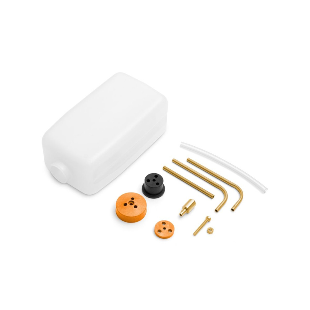 Könnyű, de masszív 284 ml-es nejlon tartály izzó üzemanyaghoz, tartós fedéllel, gumidugóval és hátlapi lemezzel. Előre hajlított sárgaréz szerelvények és szívósúly, szilikon tömlő. Méretek (nyak és kupak nélkül): 110x60x48 mm, súly: 46 g.