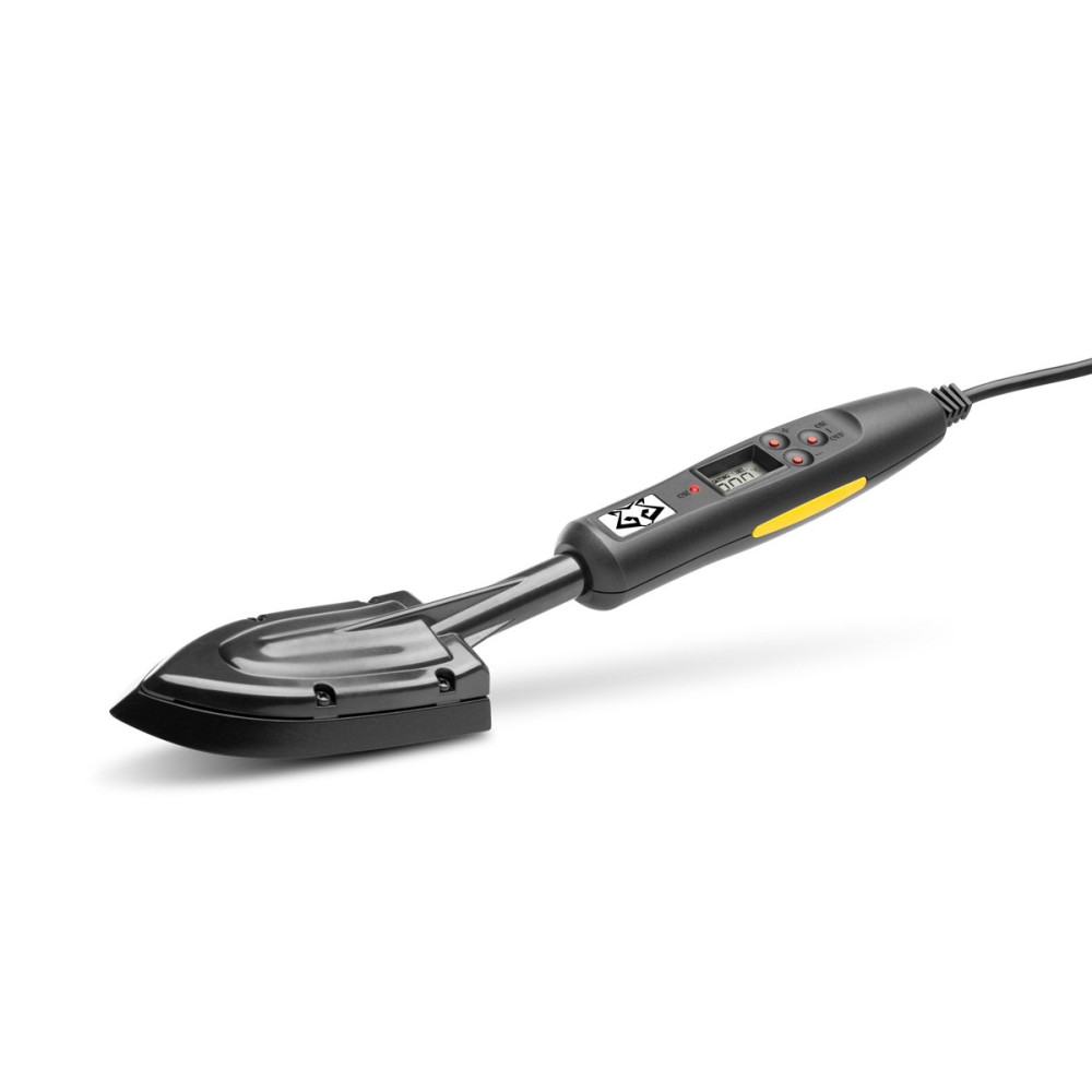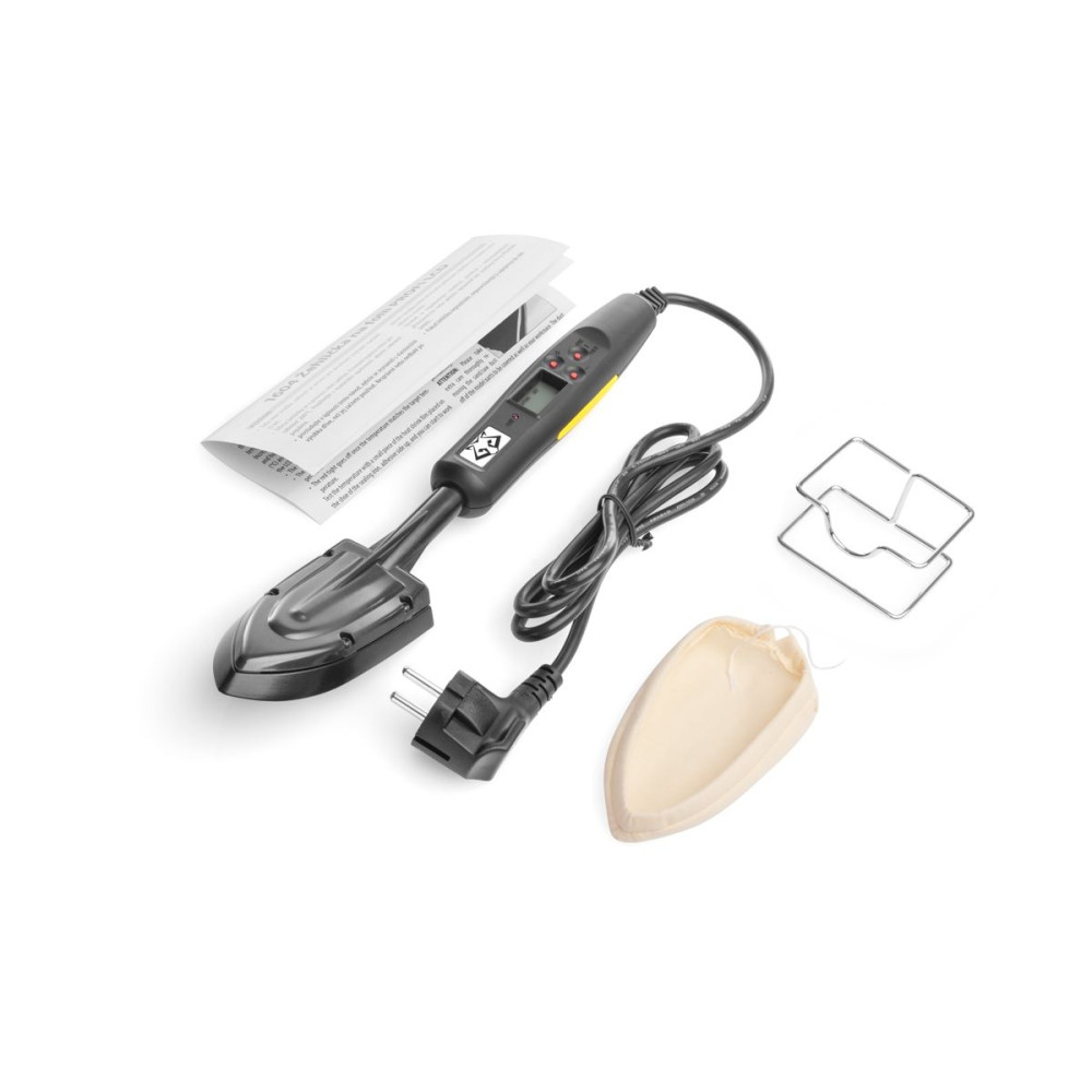 Professzionális modell bevonó vasaló teflonbevonatú testtel, elektronikus hőmérséklet-szabályozással és digitális hőmérséklet-kijelzővel. Állvánnyal és védőburkolattal kapható.